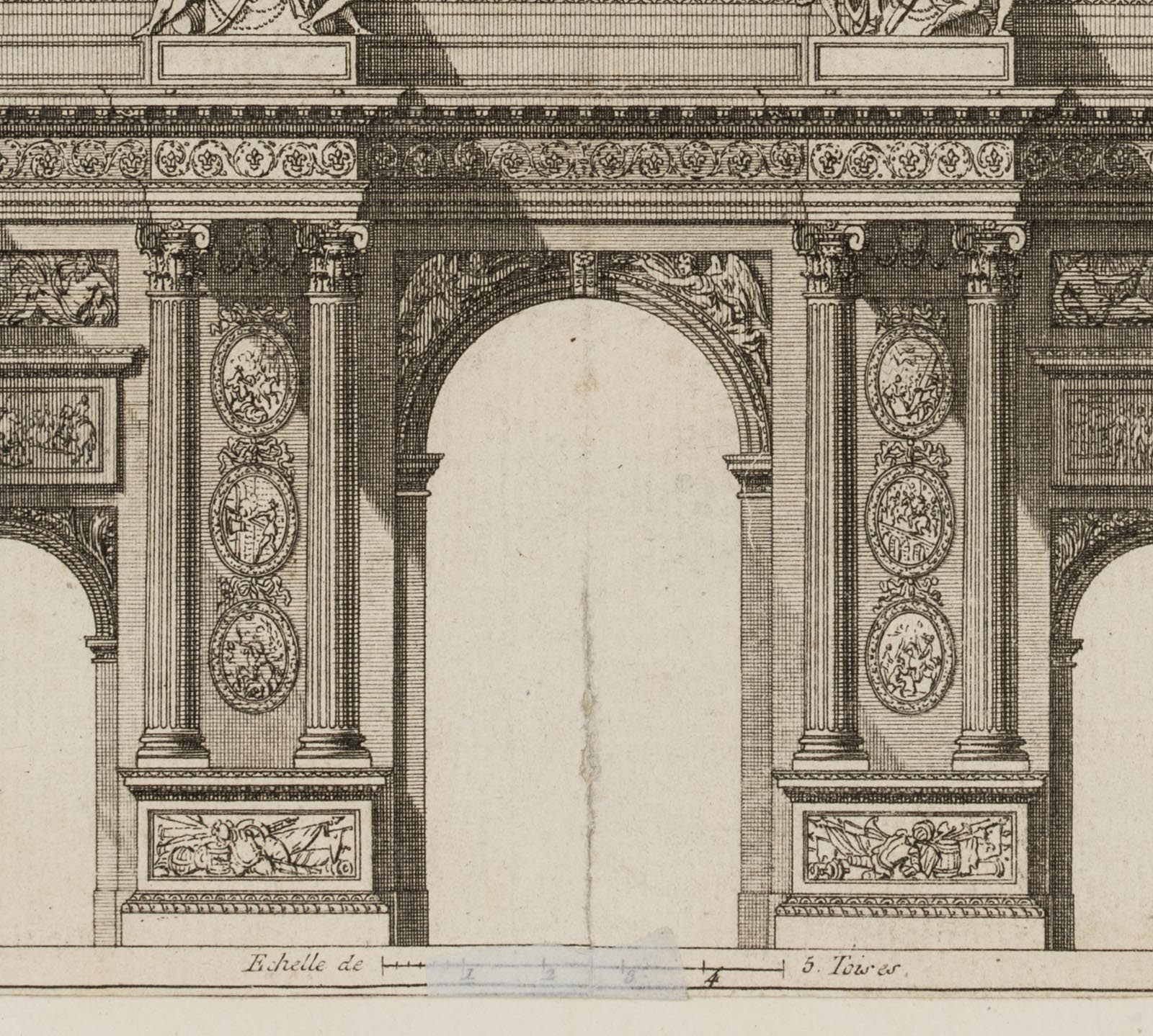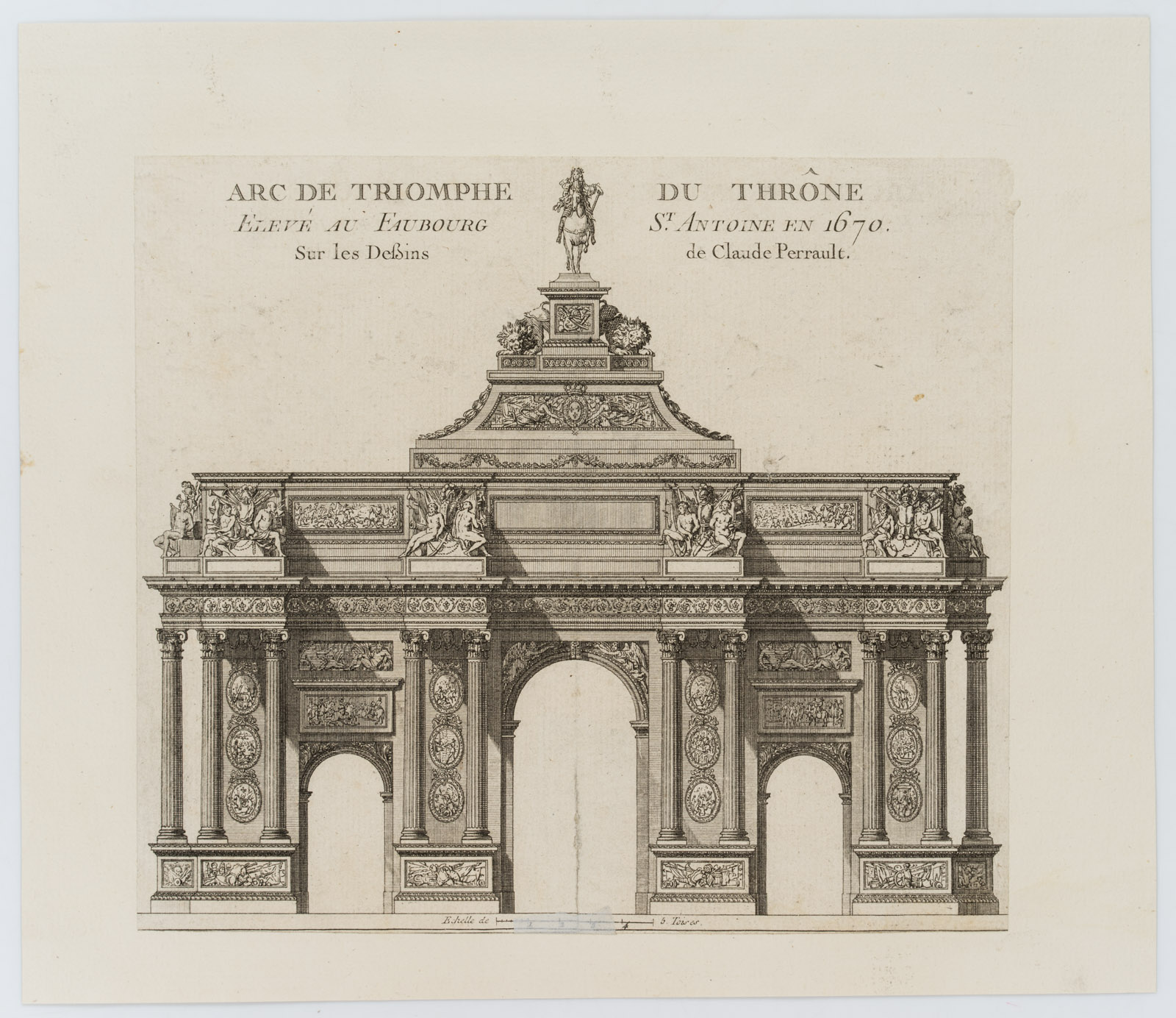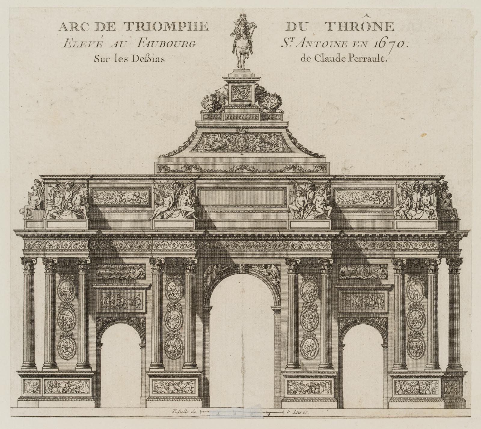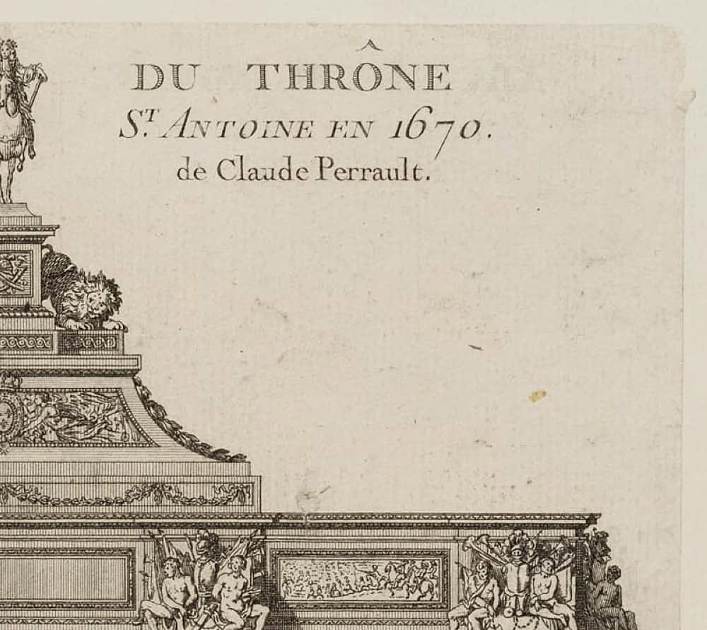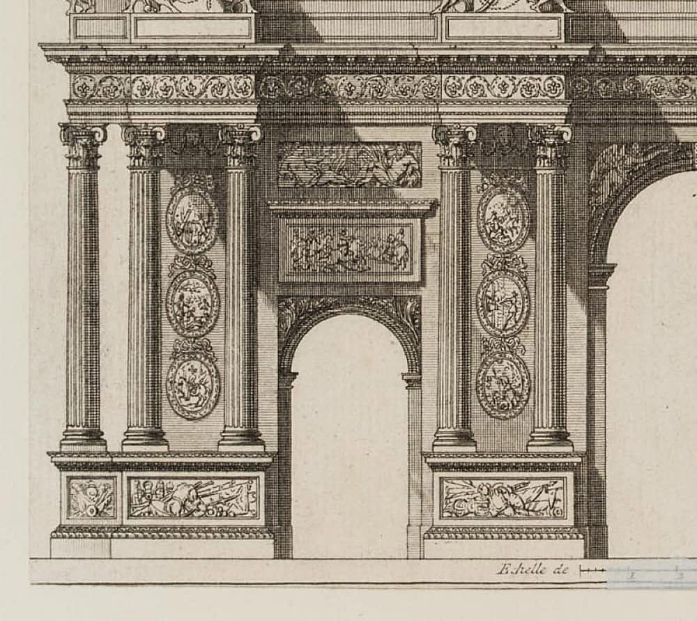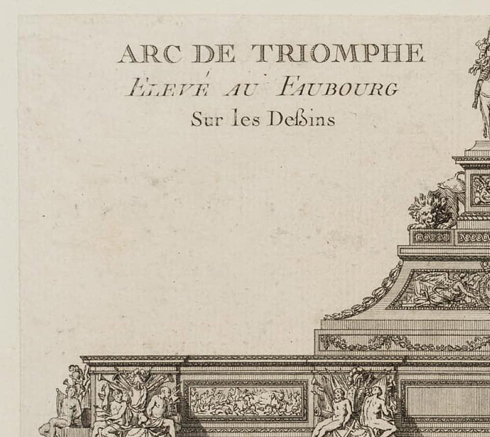 Pierre Claude Delagardette (born around 1745 Paris) after Jean-Jacques Huvé (1742 Boinvilliers – 1808 Versailles), Elevation of a triumphal arch, erected at Faubourg St. Antoine en 1670 after designs by Claude Perrault(- 1678), 18th century, Etching