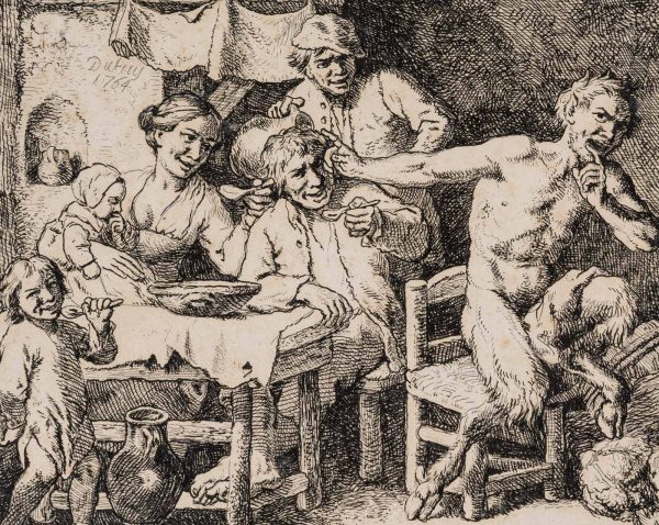 - Description: View into the living room of a farmer. with family gathered around the table and having dinner. They are visited by a satyr, who turns away from the family with his chair and gestures towards the viewer. The depiction takes up a scene from Aesop’s fable. Christian Wilhelm Ernst Dietrich, also called Christian Guillaume Ernest Dietricy, was a German painter, etcher and engraver. His printmaking work is distinguished by the virtuosity of his technique and the range of his representational motifs. In 2012, a monograph by art historian Petra Schniewind-Michel, published by Hirmer-Verlag, reintroduced the life and work of this extraordinary artist. Signed and dated “Dietricy 1764” in the centre left of the image.
