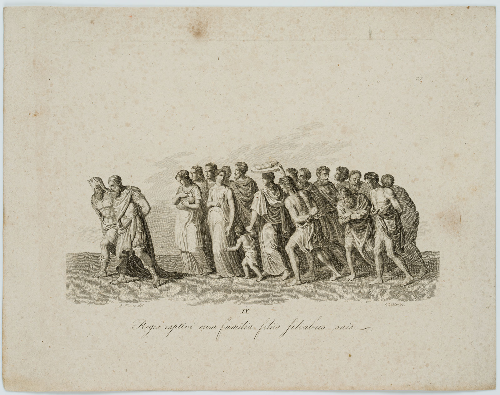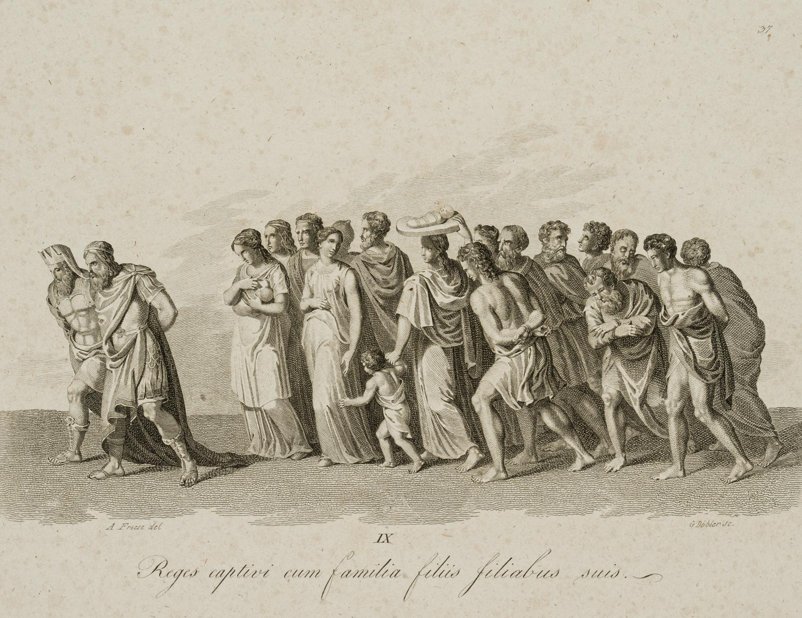 - Bezeichnung: Unterhalb der Darstellung in der Druckplatte signiert: “A. Friese del. / G. Döbler sc.”, darunter typographisch betitelt “Reges captivi cum familia filiis filiabus suis.”; Mitterbacher Prag 1819; oben rechts nummeriert “37”.