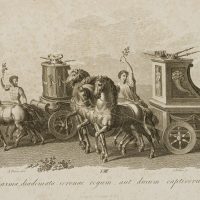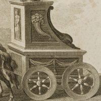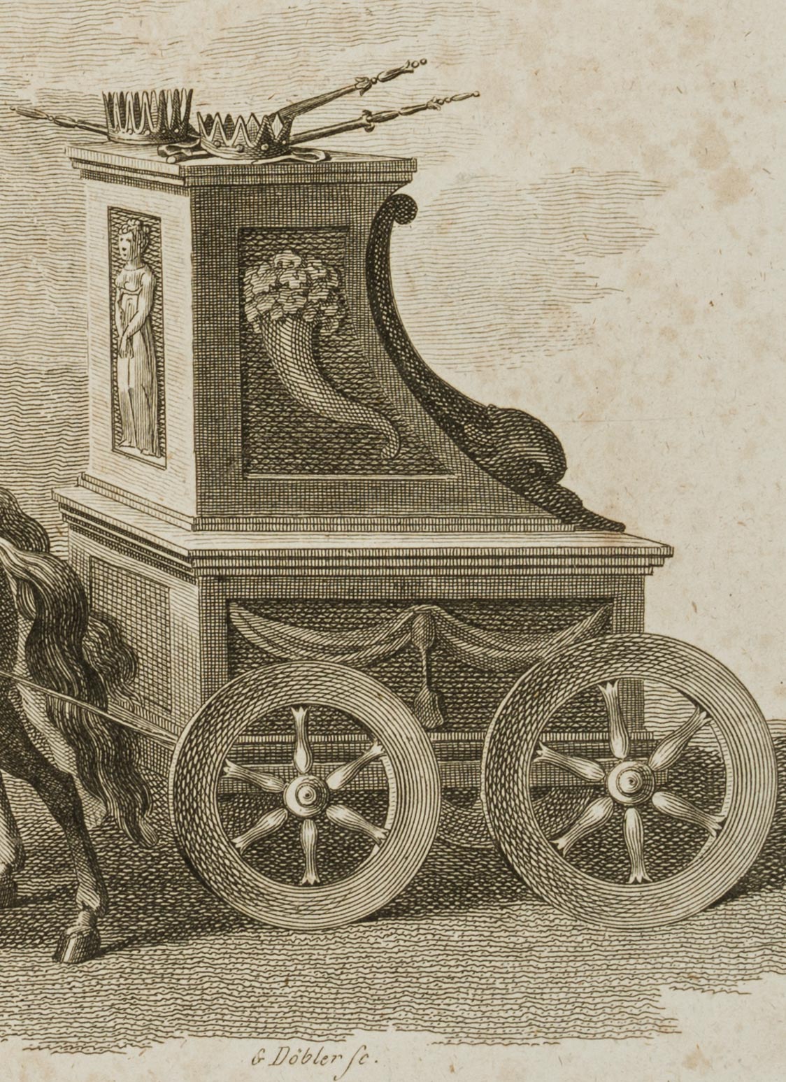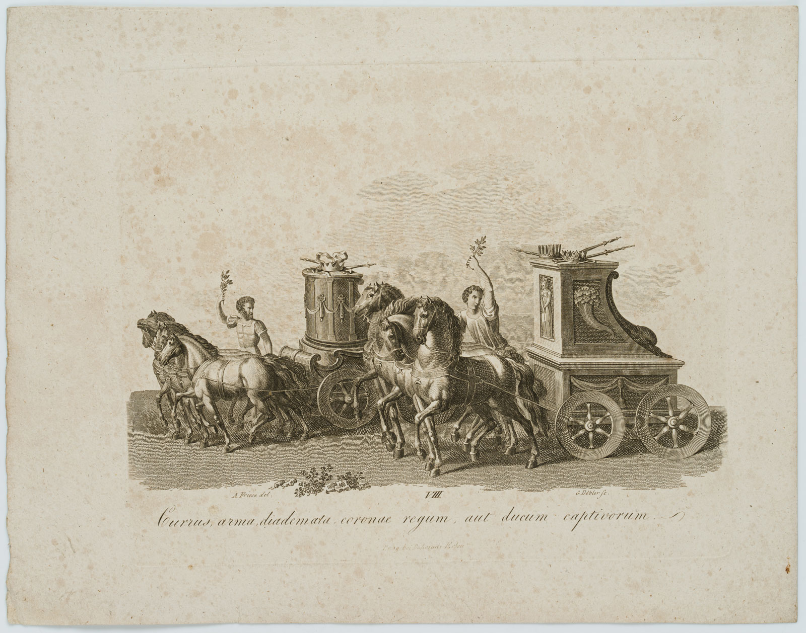 - Bezeichnung: Unterhalb der Darstellung in der Druckplatte signiert: “A. Friese del. / G. Döbler sc.”, darunter typographisch betitelt “VIII Currus, arma, diademata, coronae regum, aut ducum captivorum”; Mitterbacher Prag 1819; oben rechts nummeriert “36”.