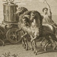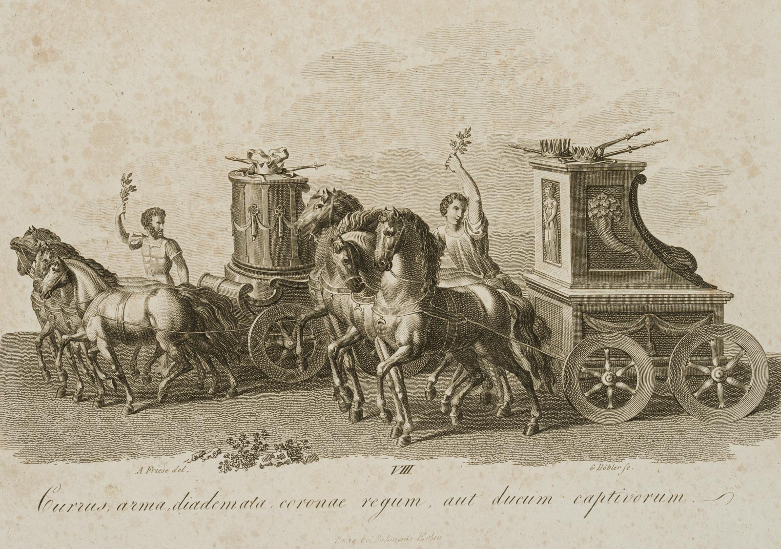 Georg Döbler (1788 Prague – 1845 Prag) after A Friese (19th century), Roman triumphal procession, victory, tribute, crown, sword, chariot, military, 1819, Copper engraving