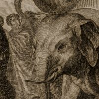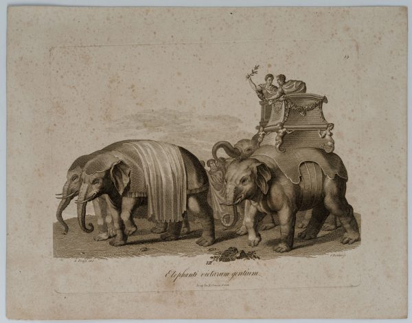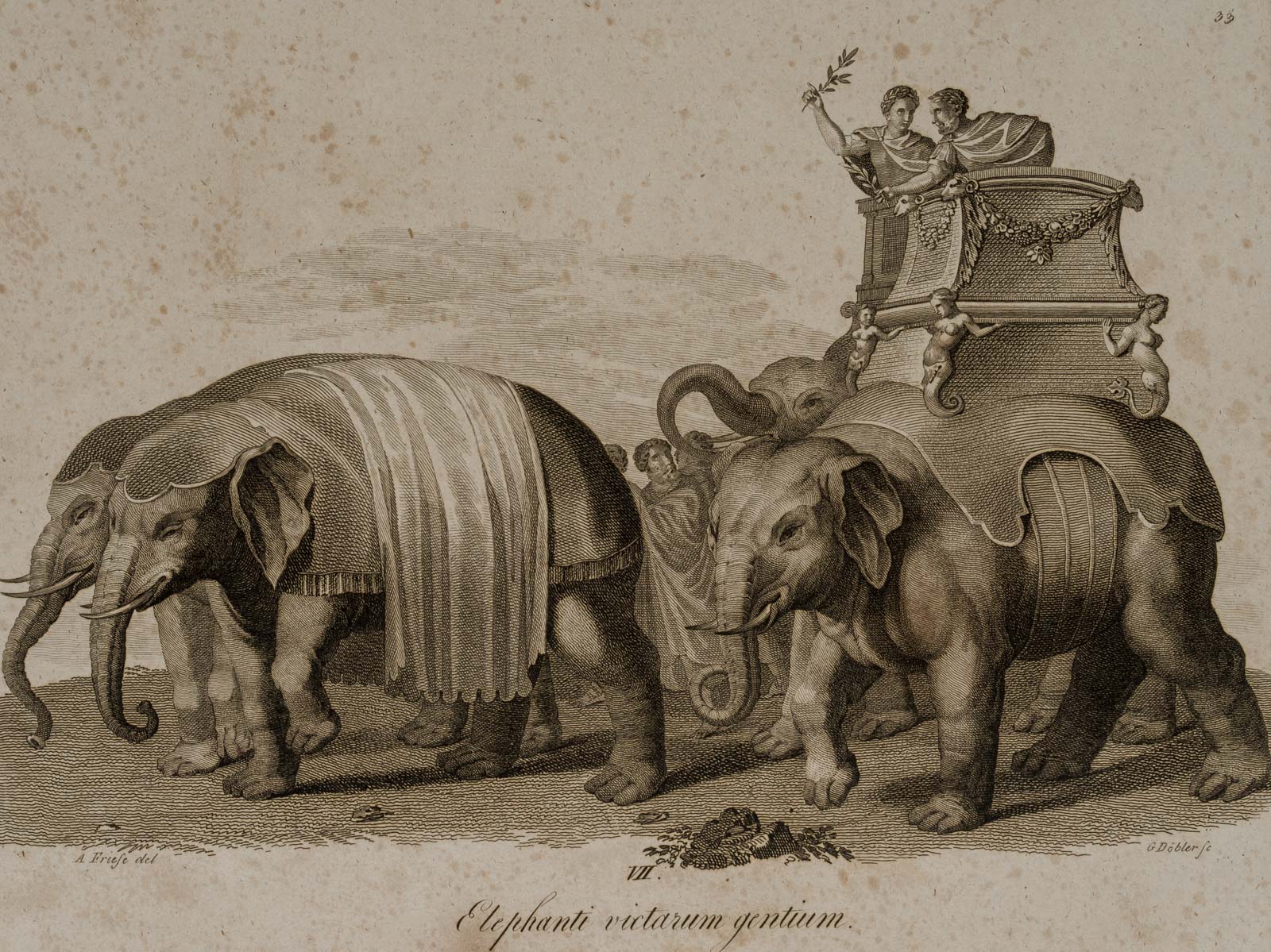 Georg Döbler (1788 Prag – 1845 ebd.) nach Unbekannt (19. Jahrhundert), “Elephanti victarum gentium”. Römische Staatselefanten, 1819, Kupferstich