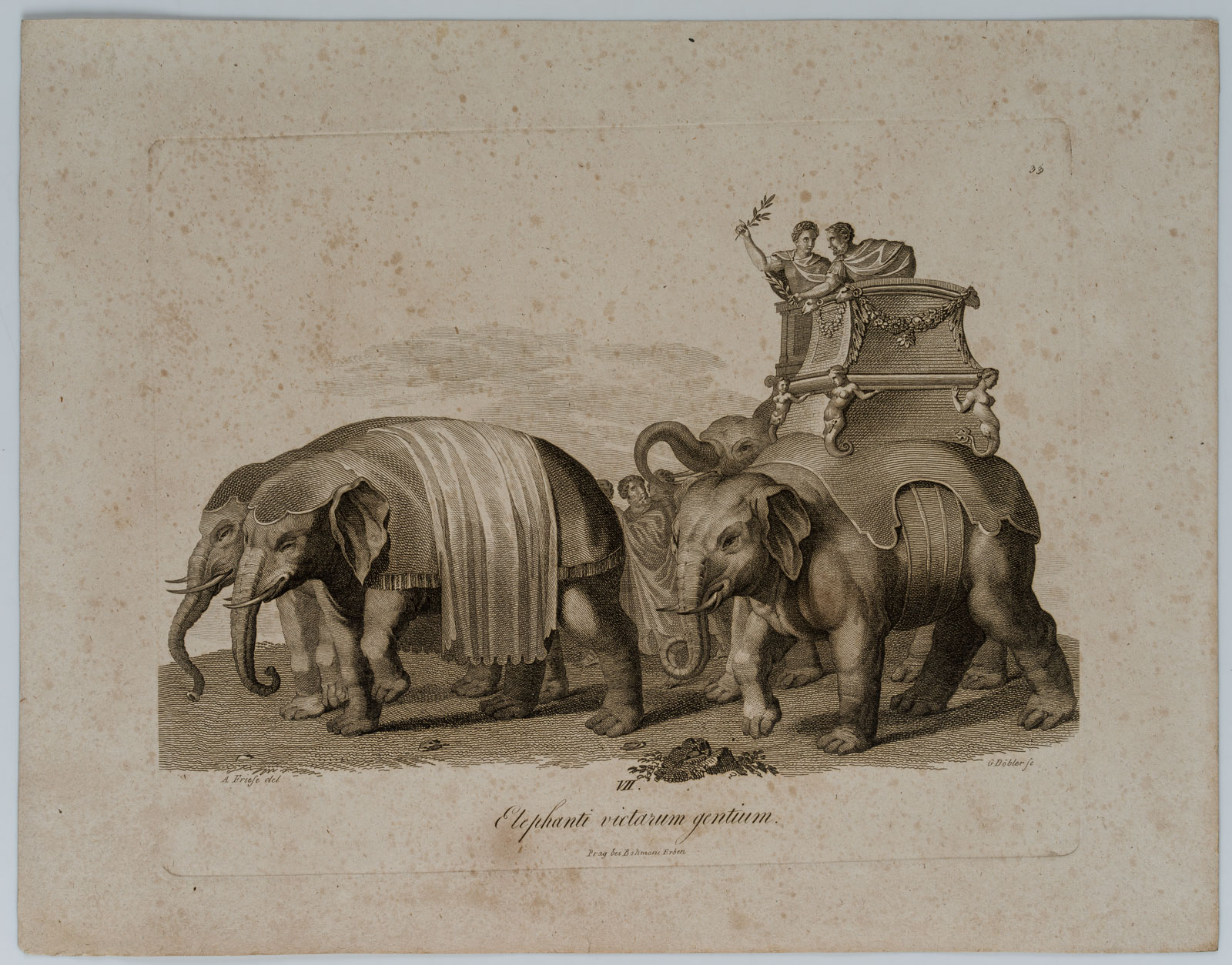 Georg Döbler (1788 Prague – 1845 Prag) after Unknown (19th century), “Elephanti victarum gentium” Roman state elephants, 1819, Copper engraving
