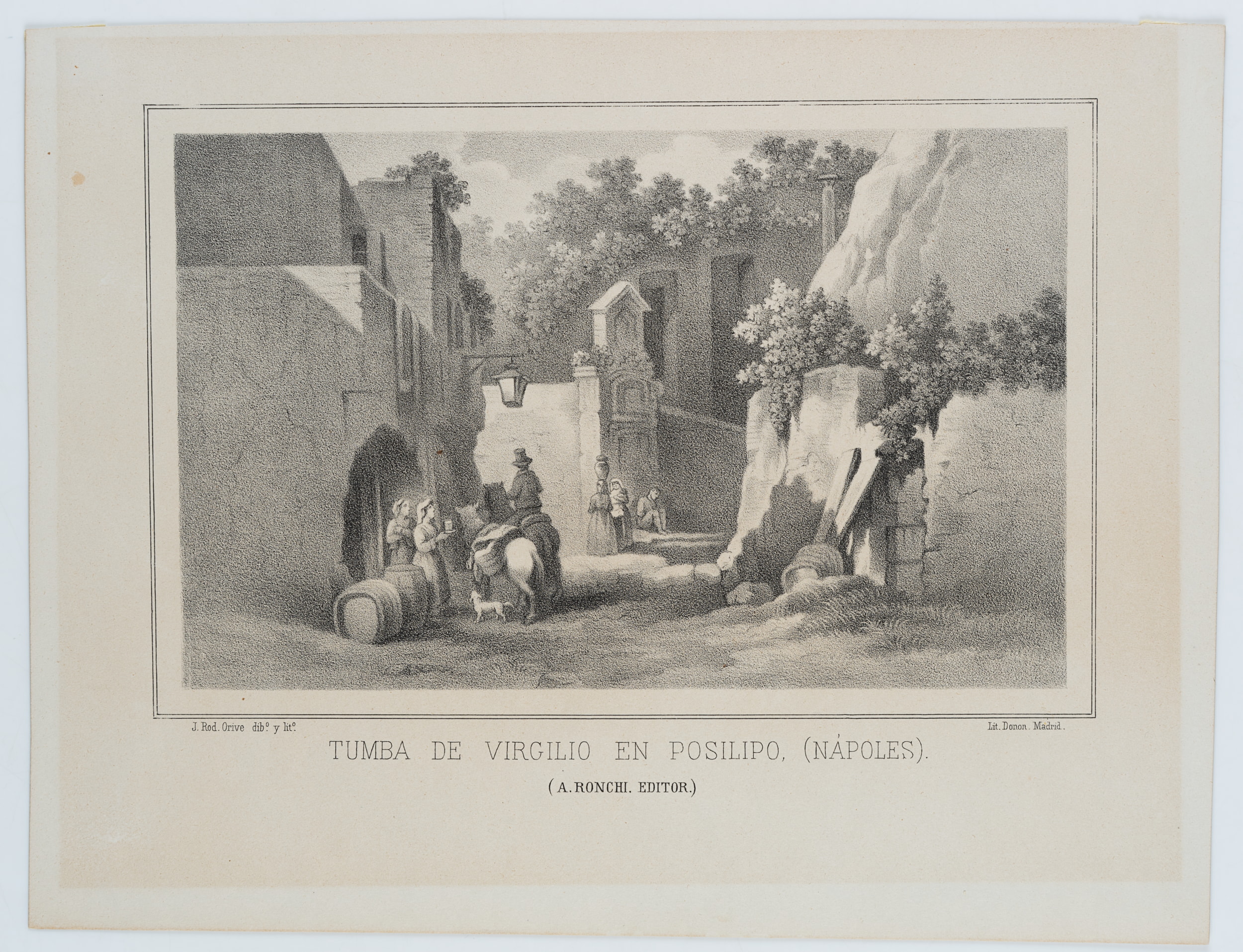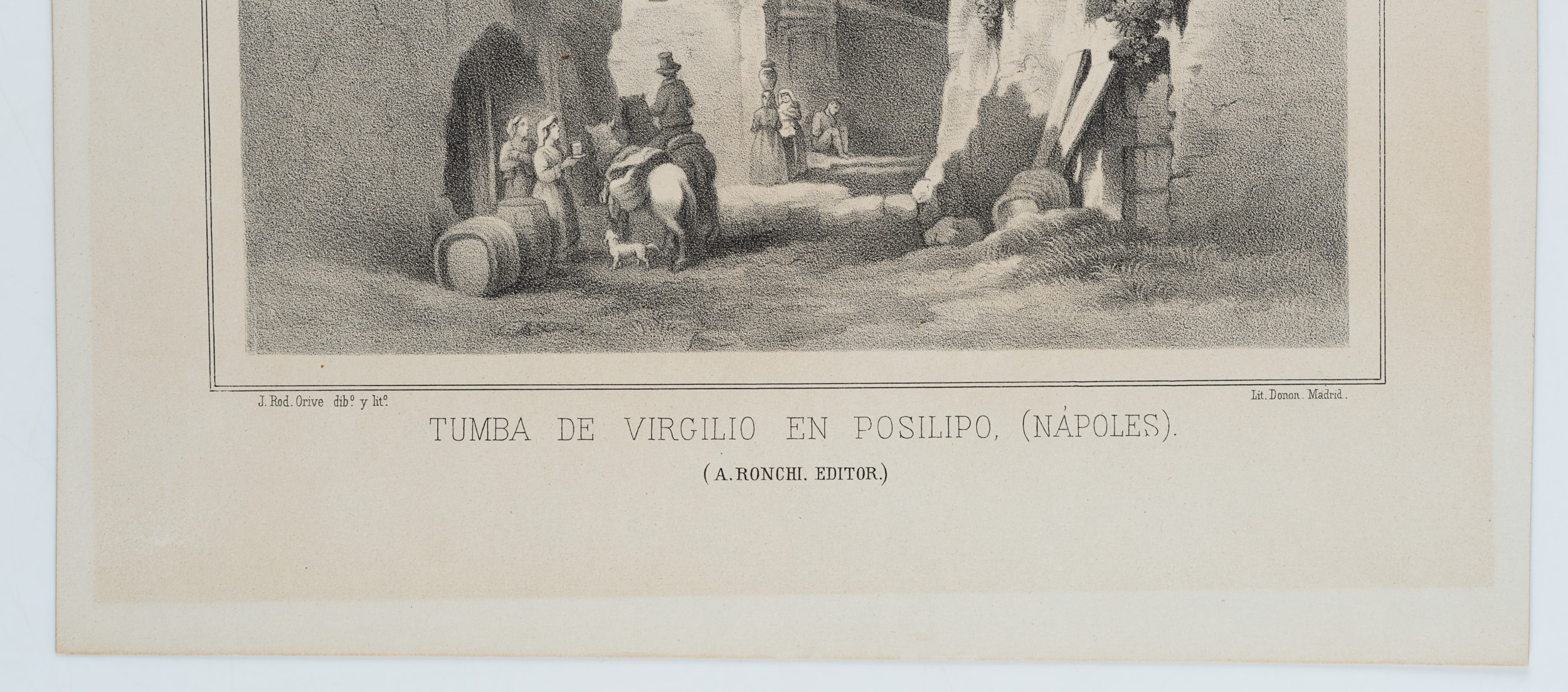 - Inscription: Lower middle signed in the printing plate: “J. Rod. Orive dib. y lit. / Lit. Donon. Madrid”. Lower middle inscribed in the printing plate: “Tumba de Virgilio en Posilipo, (Nápoles).”. Lower middle further inscription: “(A. Ronchi. Editor.)”.
