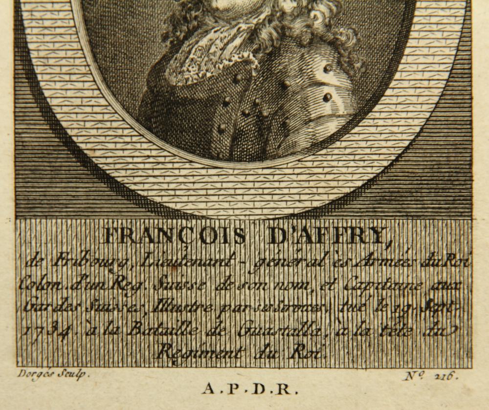 • Inscription: Inscribed below the image in the oval frame with the sitter’s name and military career: “de Fribourg, Lieutnant – gnral es Armes du Roi Colon. d’un Reg. Suisse de son nom, et Capitaine aux Gardes Suisse, Illustre par ses Services, tu le 19 Sept. 1734. la Bataille de Guastalla, la tte du Regiment dur Roi”. Signed below in the printing plate by the artist and inscribed “A.P.D.R.”.