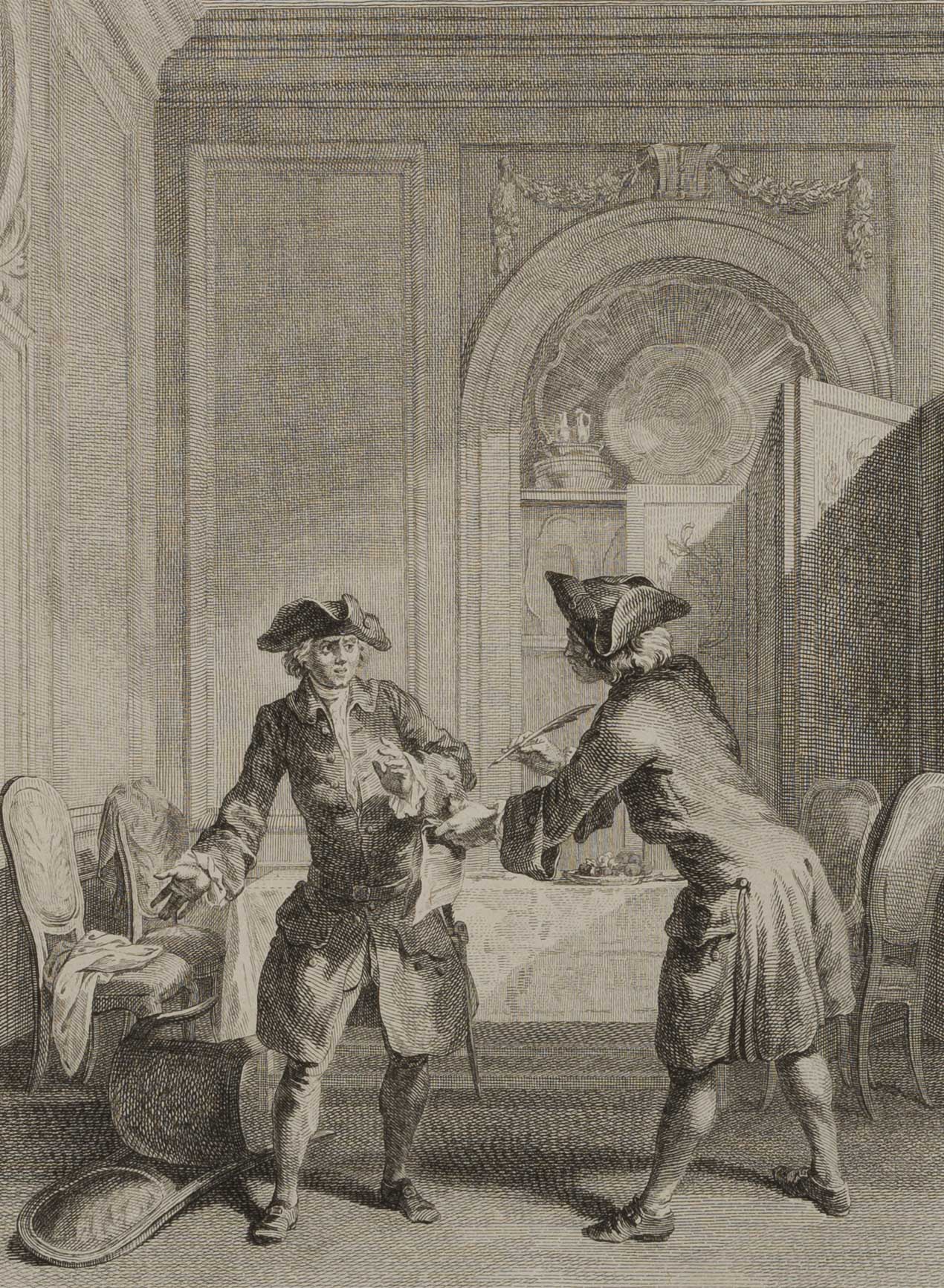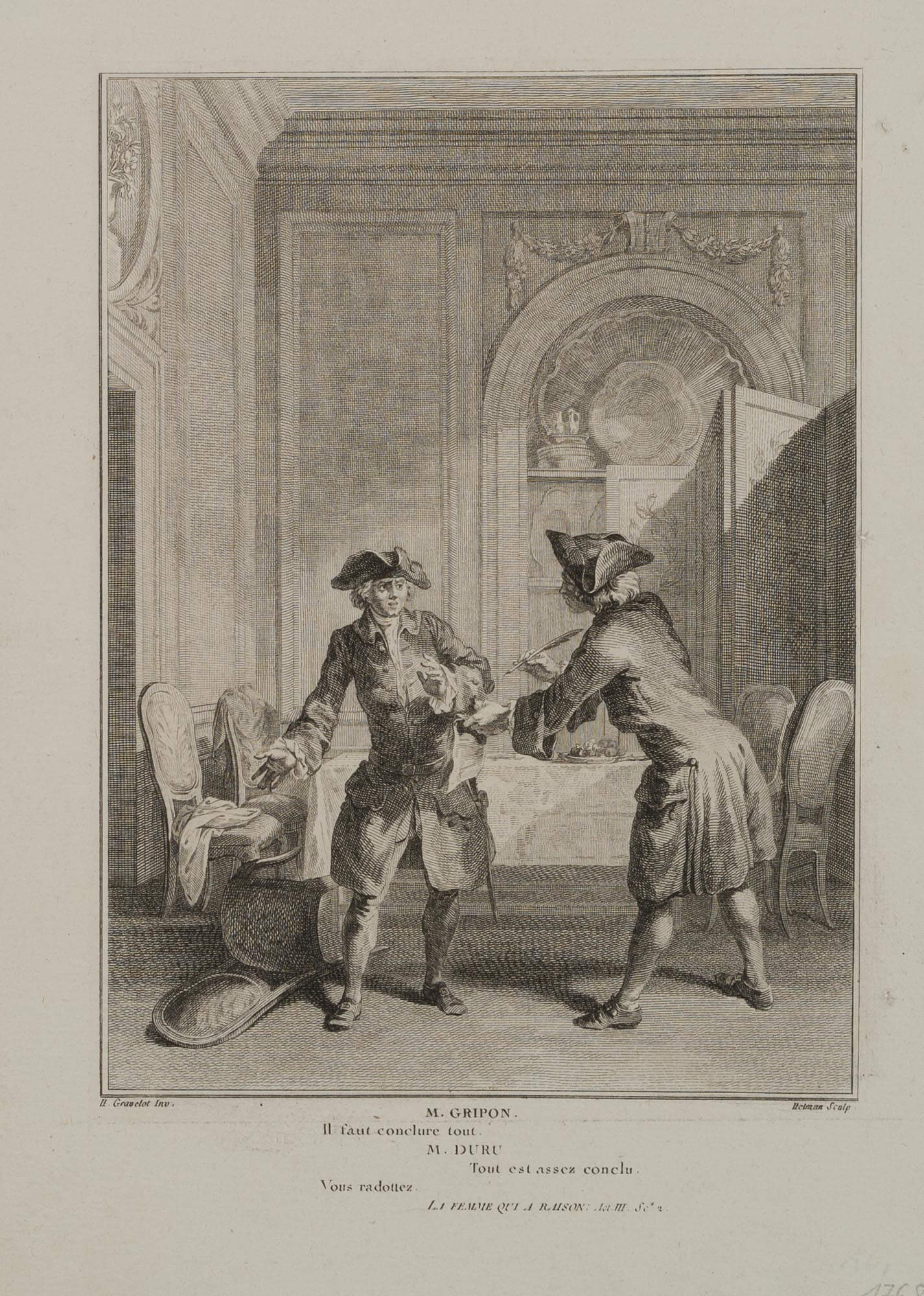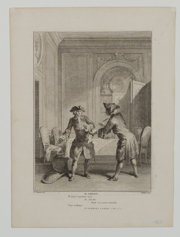 - Description: Hubert-Franois Gravelot, (1699-1773), Maler, Antoine Jean Duclos (1742-1795), Stecher, Illustration zu Voltaires La Femme qui a raison, 1768, Kupferstich. M. Gripon. We must conclude everything. M. DURU. Everything is concluded enough. You are rambling. Signiert und bezeichnet.