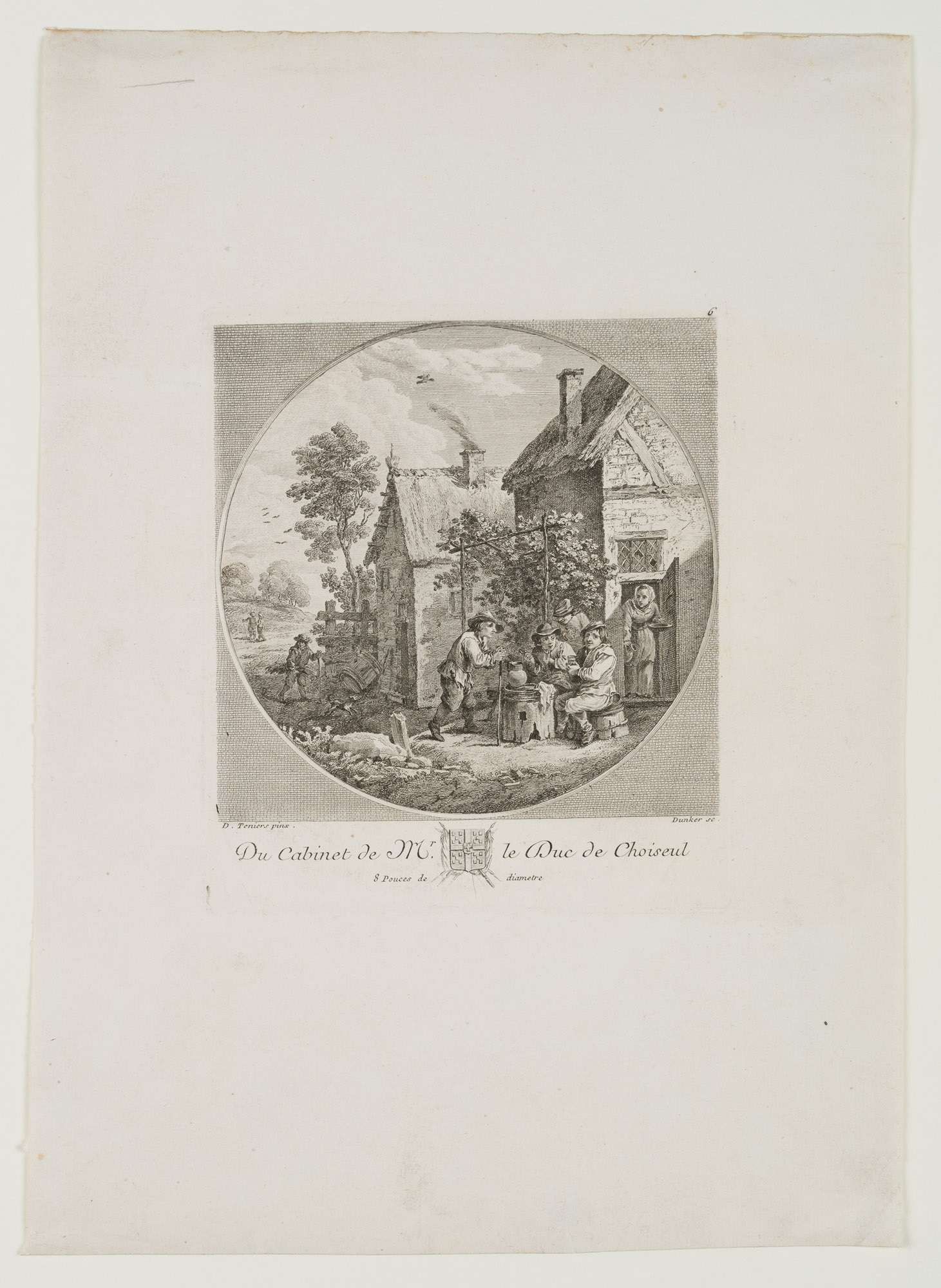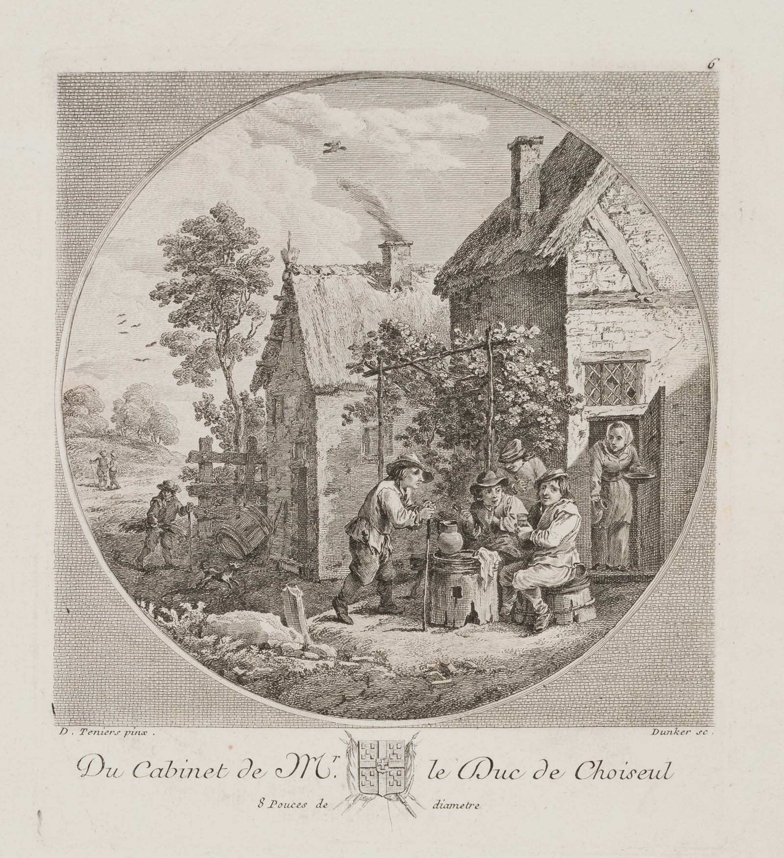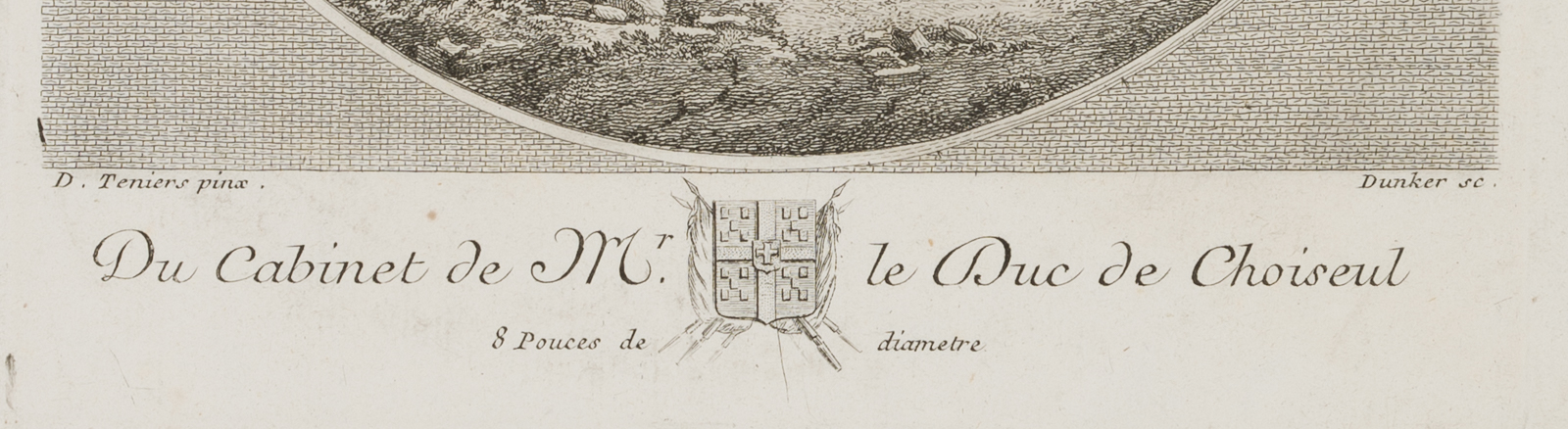 - Description: Signed “D. Teniers pinx. / Dunker sc.” below the image, inscribed “Du Cabinet de Mr. Le Duc de Choiseul” below.