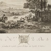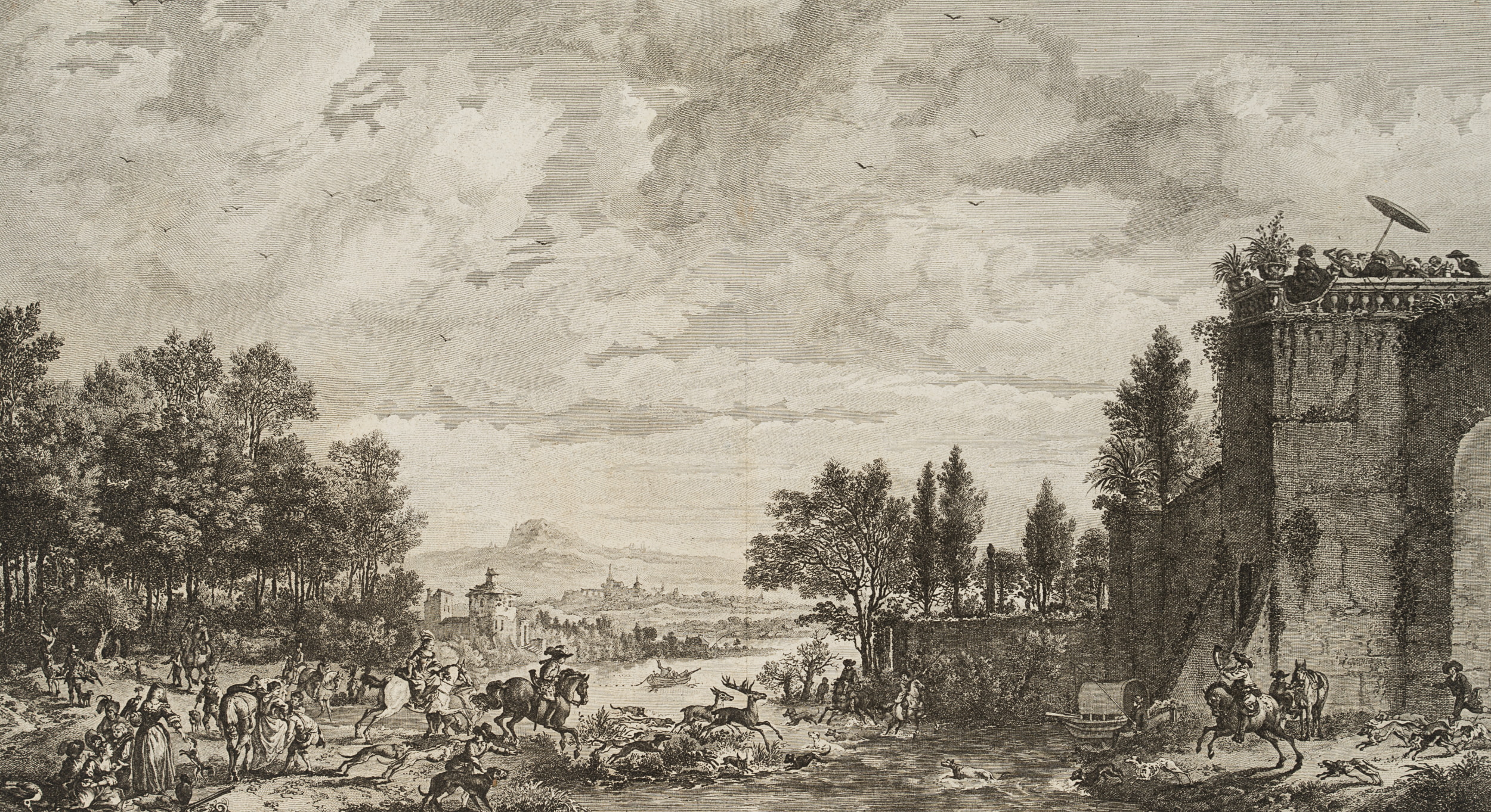 - Keywords: River landscape, gate, stag hunt, forest, boat, fisherman, rider, dog, greyhound, deer, hunting horn, rifle, town, wall, making music, parasol, castle, garden, 18th century, Baroque, Hunting, France,