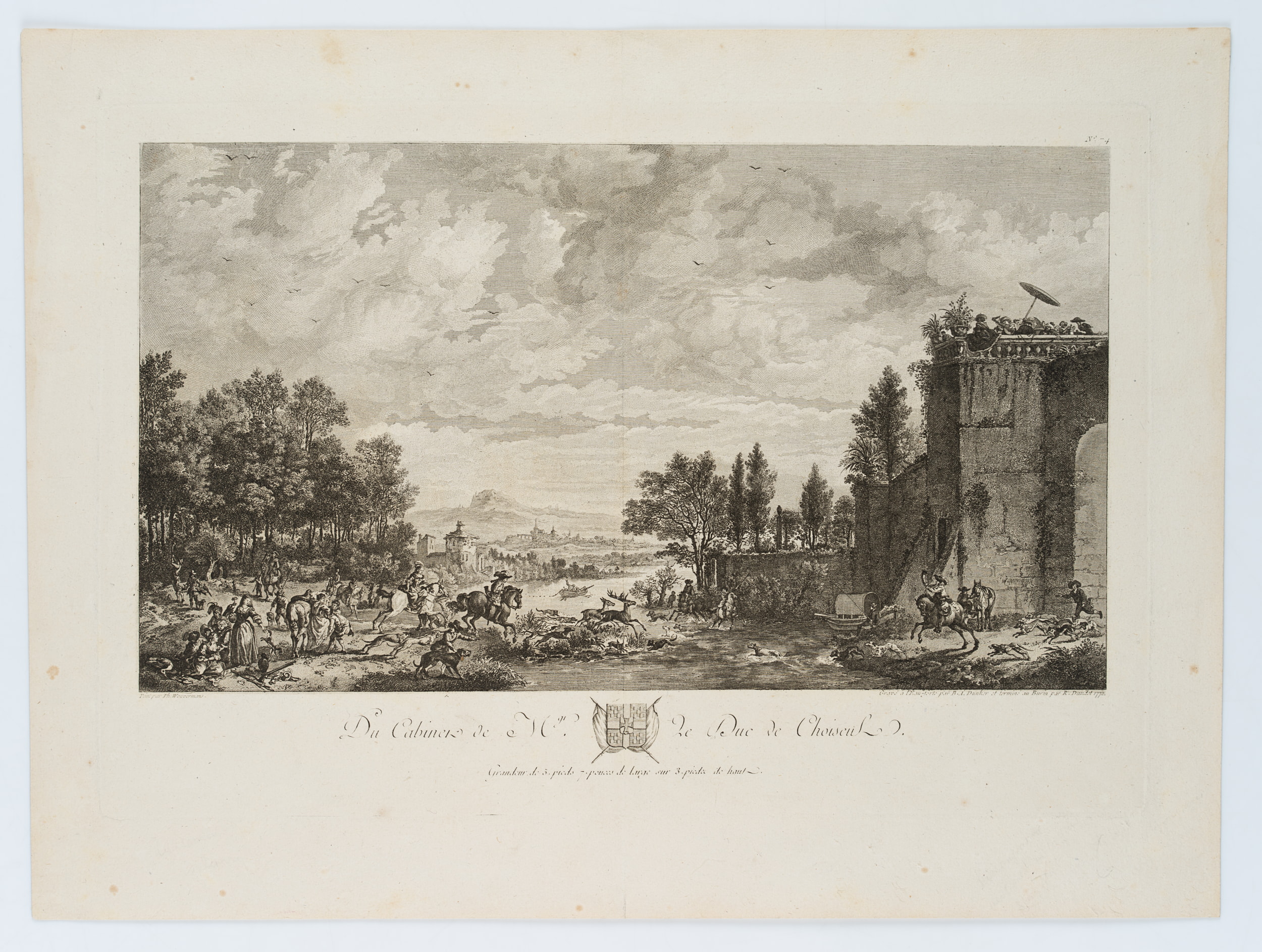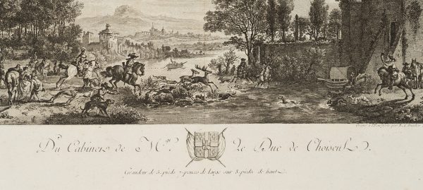 - Inscription: Lower middle inscribed in the printing plate: “Du Cabinet de Mg. le Duc de Choiseul. / Grandeur de 5. pieds 7. pouces de large sur 3. pieda de haut.”. Upper right numbered in the printing plate: “No 74”. Lower right dated: “1772”.