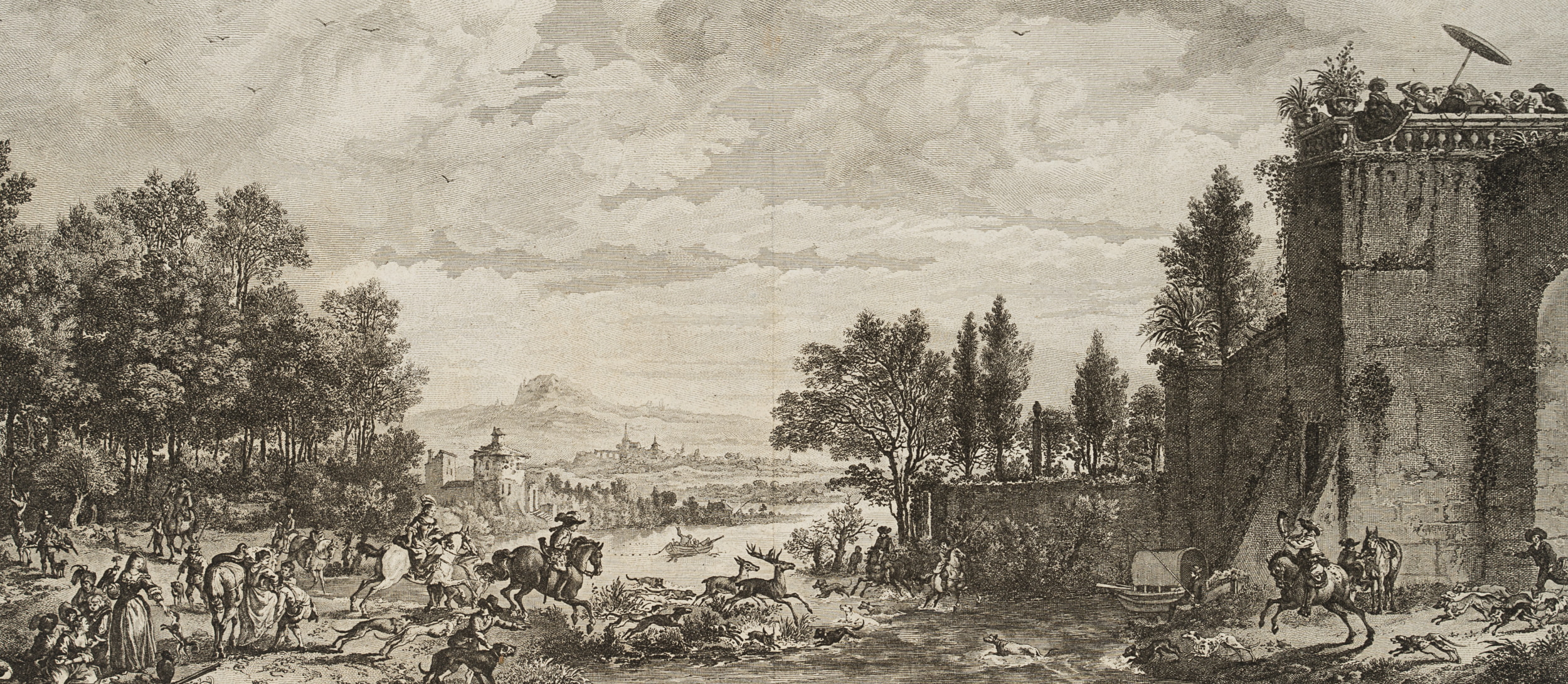 - Description: In the foreground of the landscape a deer hunt is taking place. The animals are enclosed on both sides of a river by hunters and greyhounds. On the right edge of the picture on a stone fortification a group is playing music under a parasol. In the middle ground people are rowing in a boat and in the background a hilly landscape and the silhouette of a town appear.