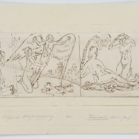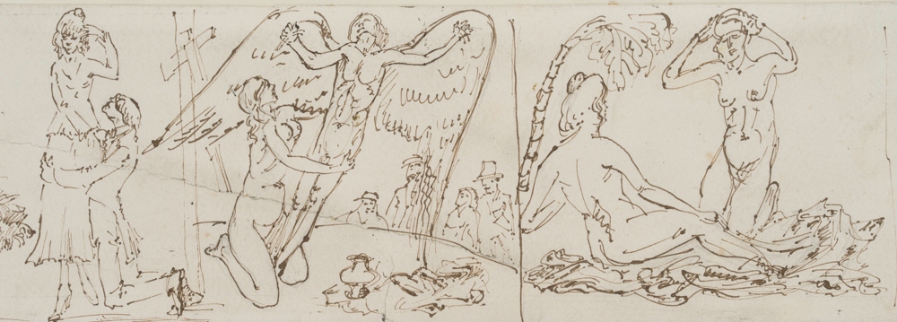 - Description: Representational strip with separate scenes: On the left a young couple, the man kneels imploringly before his beloved. In the centre a female nude holding an angelic figure, reminiscent of the crucified Jesus Christ. On the right two female nudes, one lying in a supine view, the other kneeling and tussling her hair.