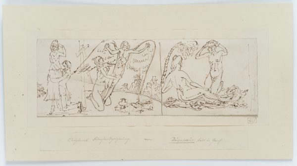 - Beschreibung: Darstellungstreifen mit getrennten Szenen: Links ein junges Paar, der Mann kniet flehend vor seiner Geliebten. Mittig ein weiblicher Akt, der ergriffen eine Engelsgestalt hält, die an den gekreuzigten Jesus Christus erinnert. Rechts zwei weibliche Akte, einer in Rückenansicht liegend, der andere kniend und sich die Haare raufend.
