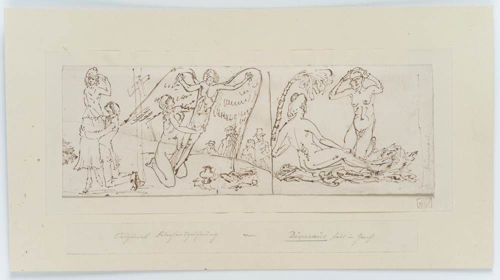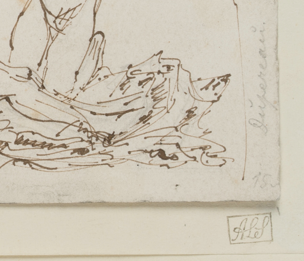 - Bezeichnung: Auf der alten Unterlage befindet sich der Sammlungsstempel des Arthur Louis Sellier (Lugt 142a) “ALS”. Unten auf einem separaten Streifen der alten Unterlage in Bleistift bezeichnet: Original Federhandzeichnung von Duperaux lebt in Genf”.