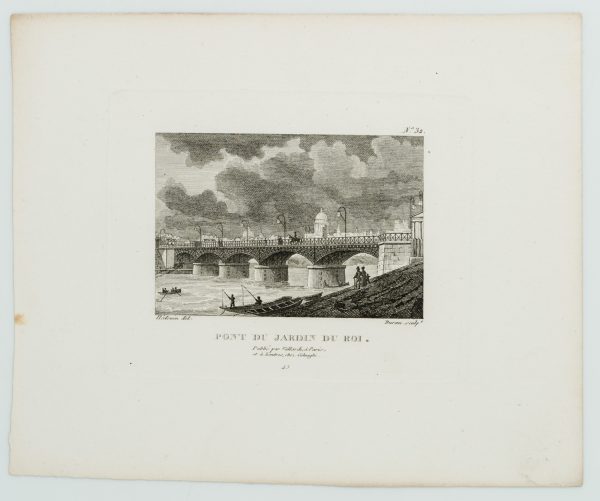 - Beschreibung: In der Druckplatte links unterhalb des Bildes signiert mit “Hedouin del.” und rechts mit “Durau sculp”. Mittig darunter betitelt mit “PONT DU JARDIN DU ROI.”. Das Blatt trägt oben rechts die Nummer “32”.