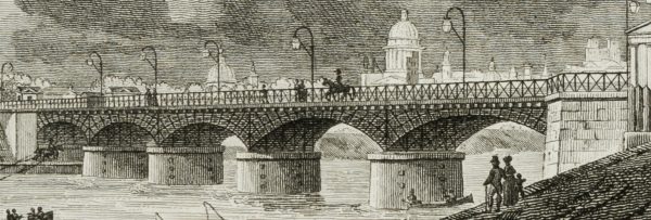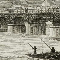 Henri Durau (19th century) after Hedouin (19th century), View from the shore of the Pont du Jardin du Roi (now Pont d’Austerlitz) bridge with fishermen on the shore and dark gathering clouds in the sky, Paris, 19th century, Steel engraving