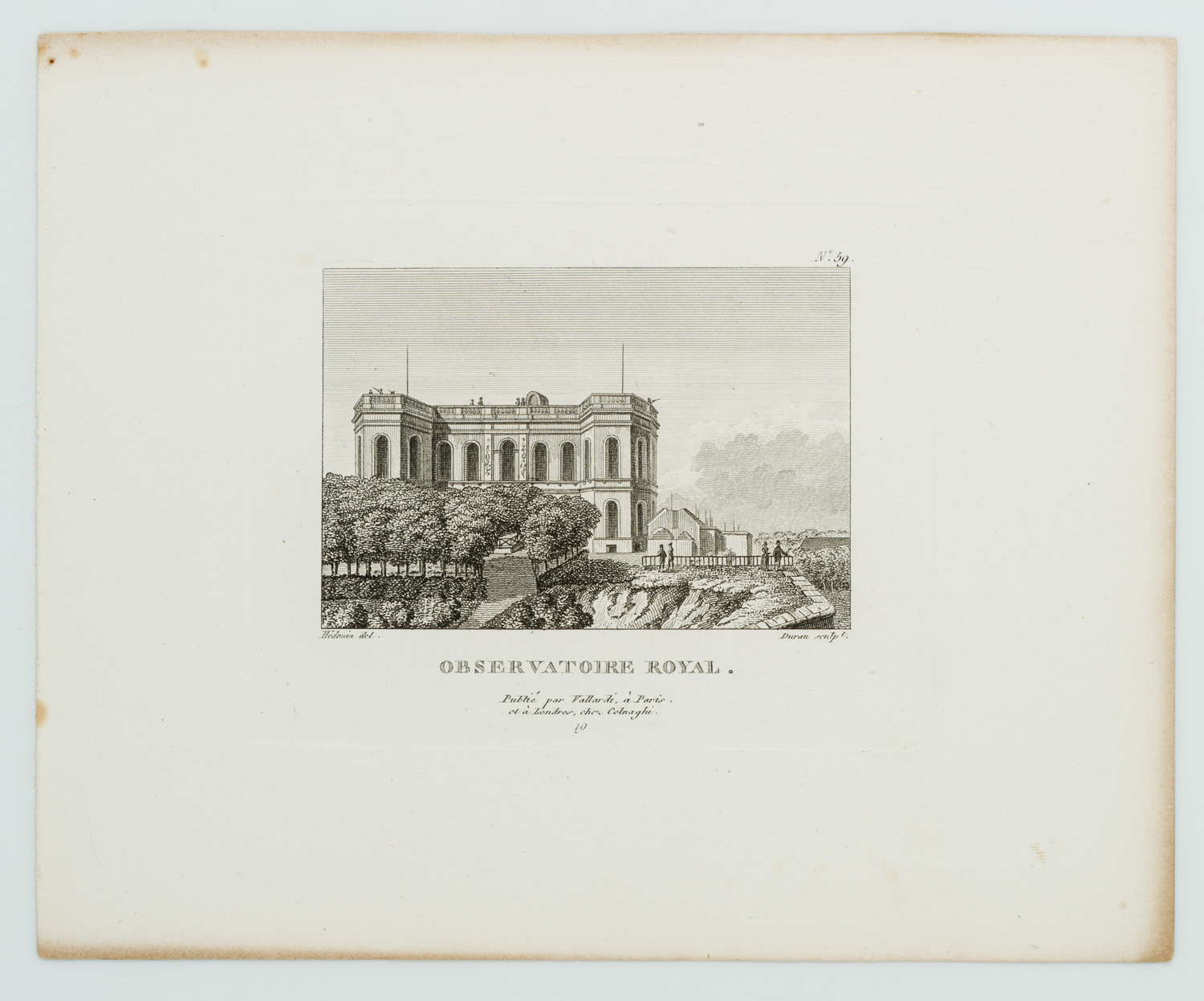 - Beschreibung: In der Druckplatte links unterhalb des Bildes signiert mit “Hédouin del.” und rechts mit “Durau sculp”. Mittig darunter betitelt mit “OBSERVATOIRE ROYAL”. Das Blatt trägt oben rechts die Nummer “59”.