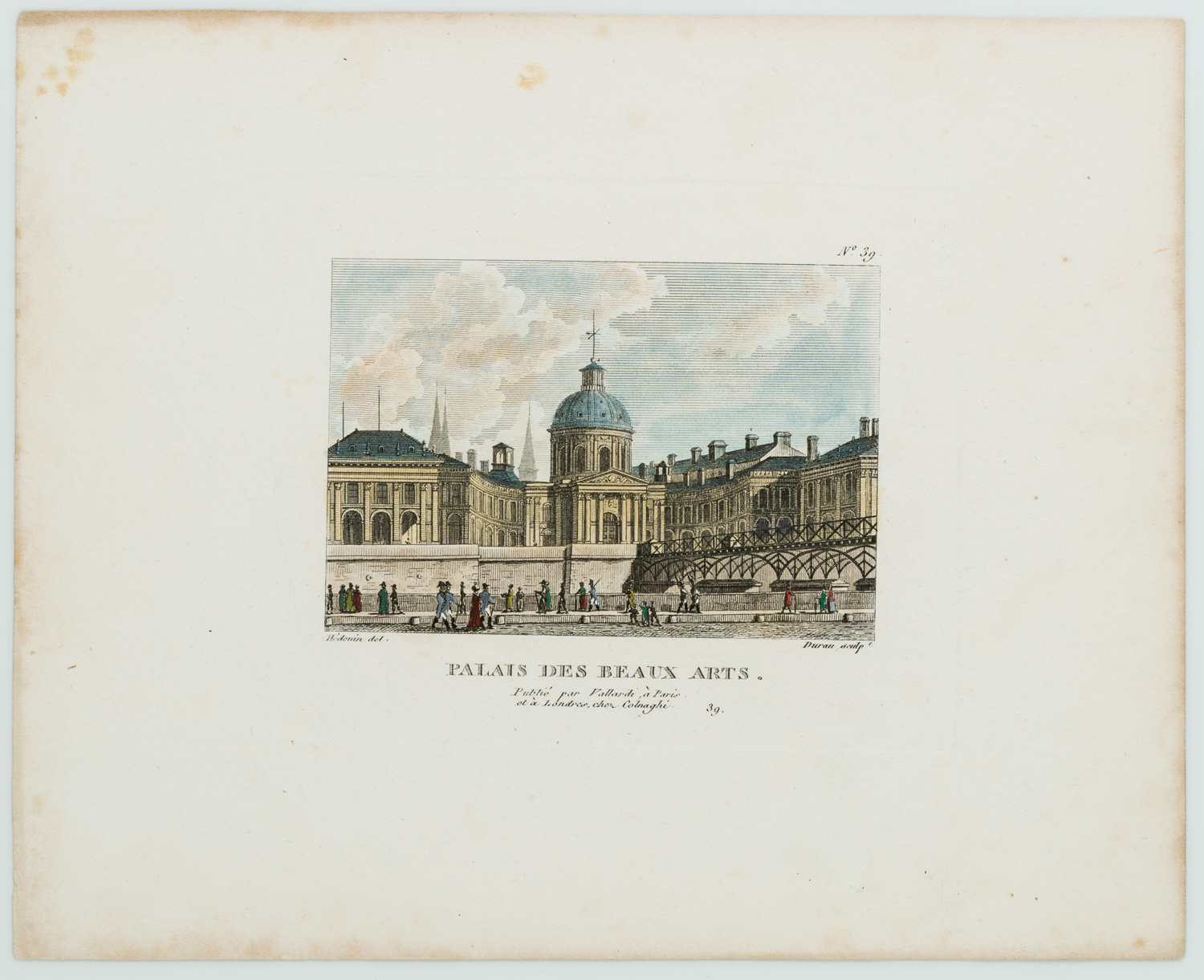 - Description: Signed “Hédouin del.” in the printing plate below the picture on the left and “Durau sculp” on the right. Titled “PALAIS DES BEAUX ARTS” in the centre below. The sheet bears the number “39” in the upper right corner.
