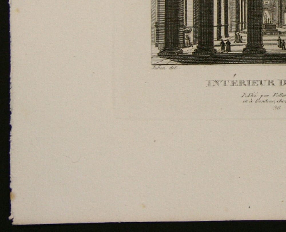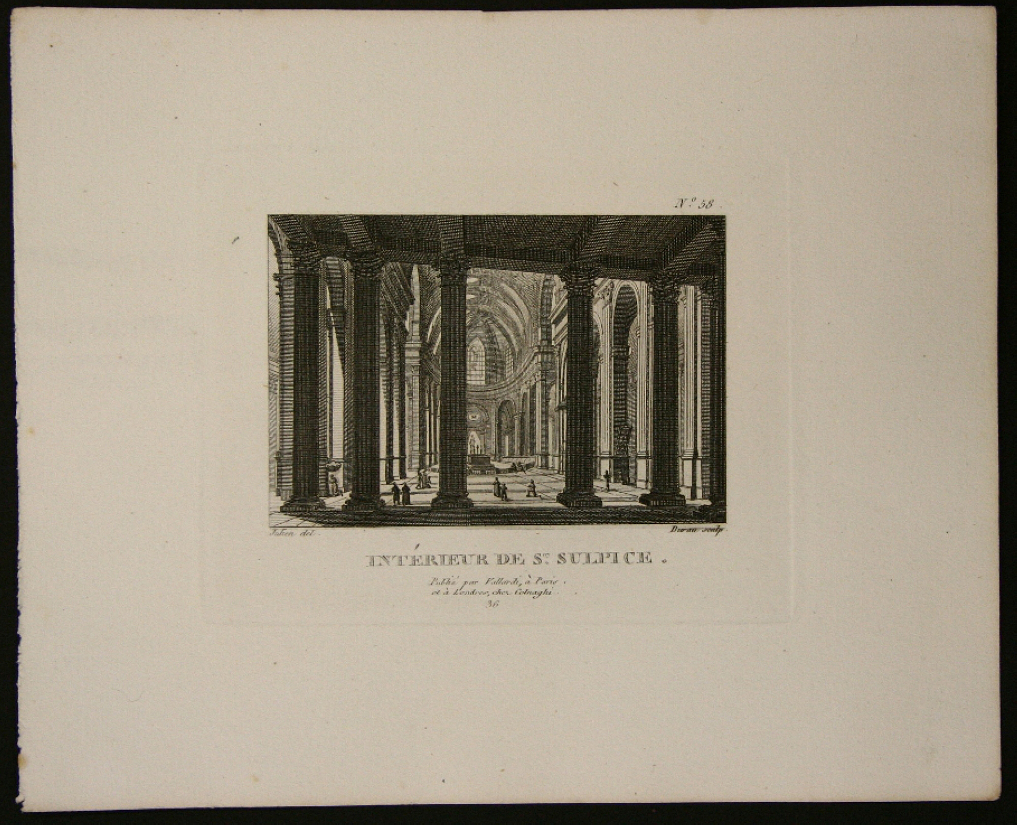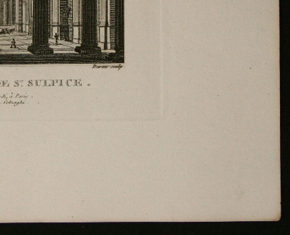 - Description: Henri Durau, Saint Sulpice Church (interior view), steel engraving after Julien, c. 1860. Description: Fascinating steel engraving by Henri Durau after Julien, inscribed: “N 58 Julien del. Durau sculp. Intrieur de St. Sulpice. Publi par Valladi Paris et Londres chez Colnaghi. 36”. Durau chose the viewer’s point of view in the lower portico of the west side, so that the viewer looks through the columns into the central nave. Mighty and dark, the columns tower in the foreground, making the worshippers standing or kneeling in the church seem particularly small. The foundations of this church from the Paris district of Saint-Germain-des-Prs date back to the 12th century. Demolition in the 17th century was followed by several phases of reconstruction until the church was completed in the 18th century. Today, Saint Sulpice is a three-nave basilica with a gallery and, with a width of 57 m and a length of 118 m, is one of the largest churches in Paris. Henri Durau (Paris, c. 1869) was a French architectural engraver.
