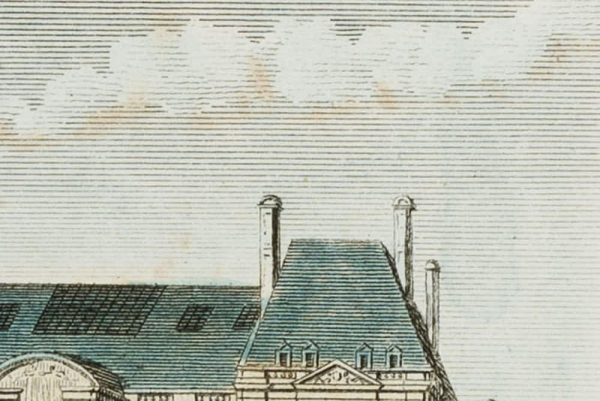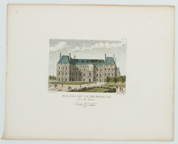 - Beschreibung: In der Druckplatte links unterhalb des Bildes signiert mit “Julien del.” und rechs mit “Durau sculp.”. Mittig darunter betitelt mit “PALAIS DU LUXEMBOURG”. Das Blatt trägt oben rechts die Nummer “56”.