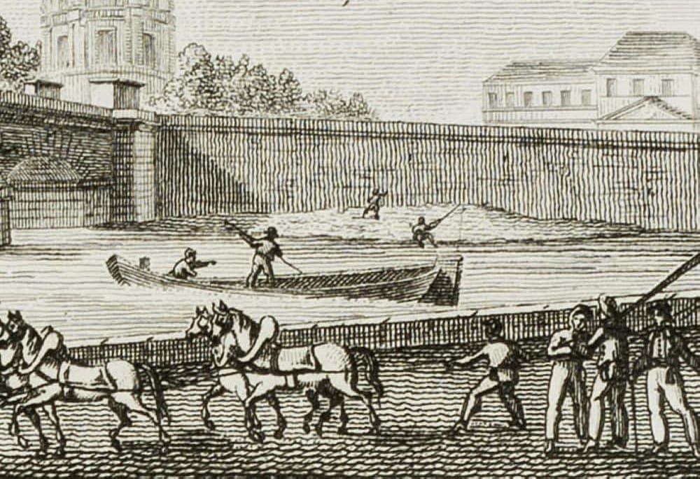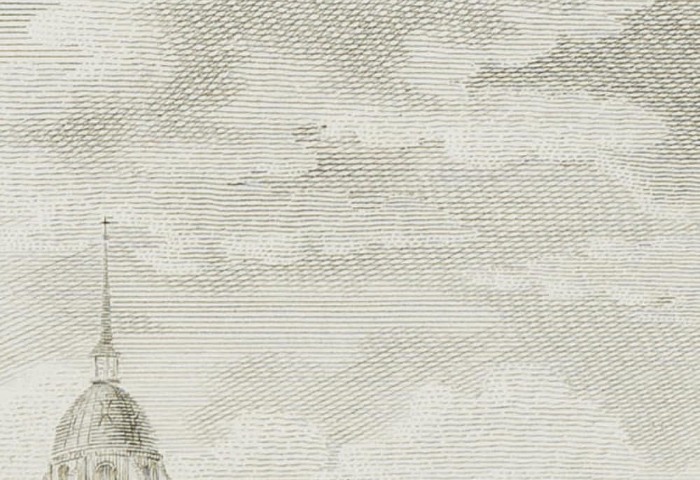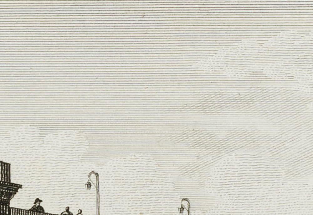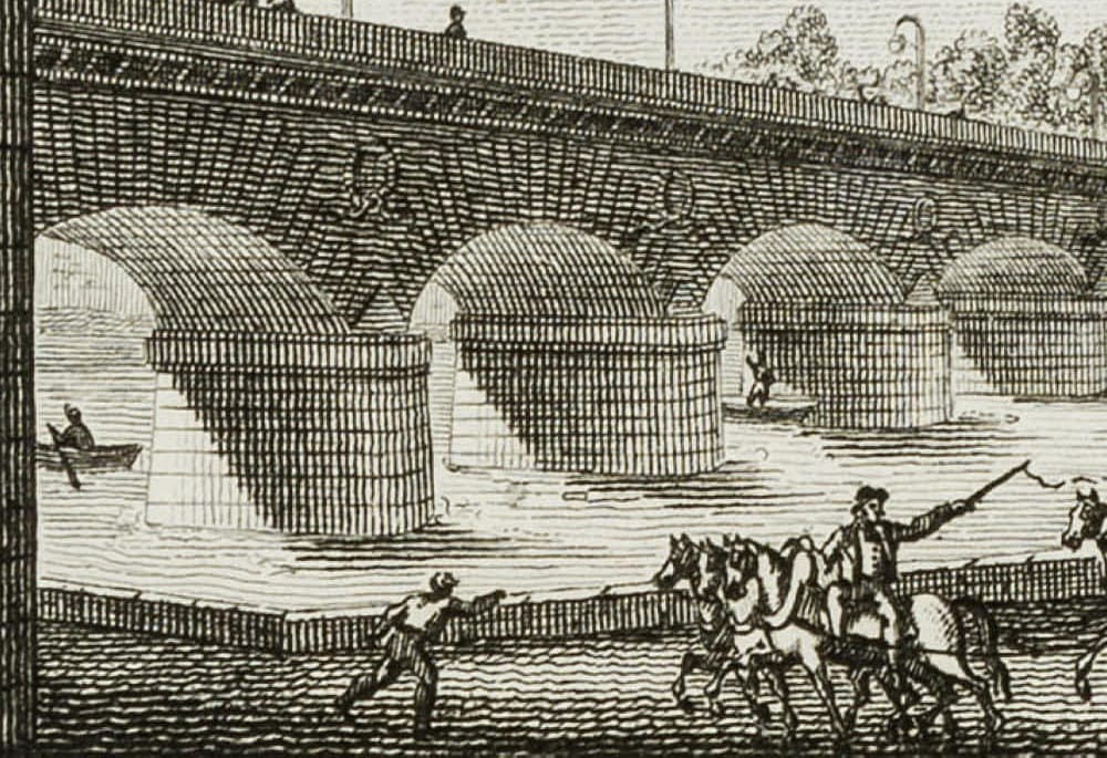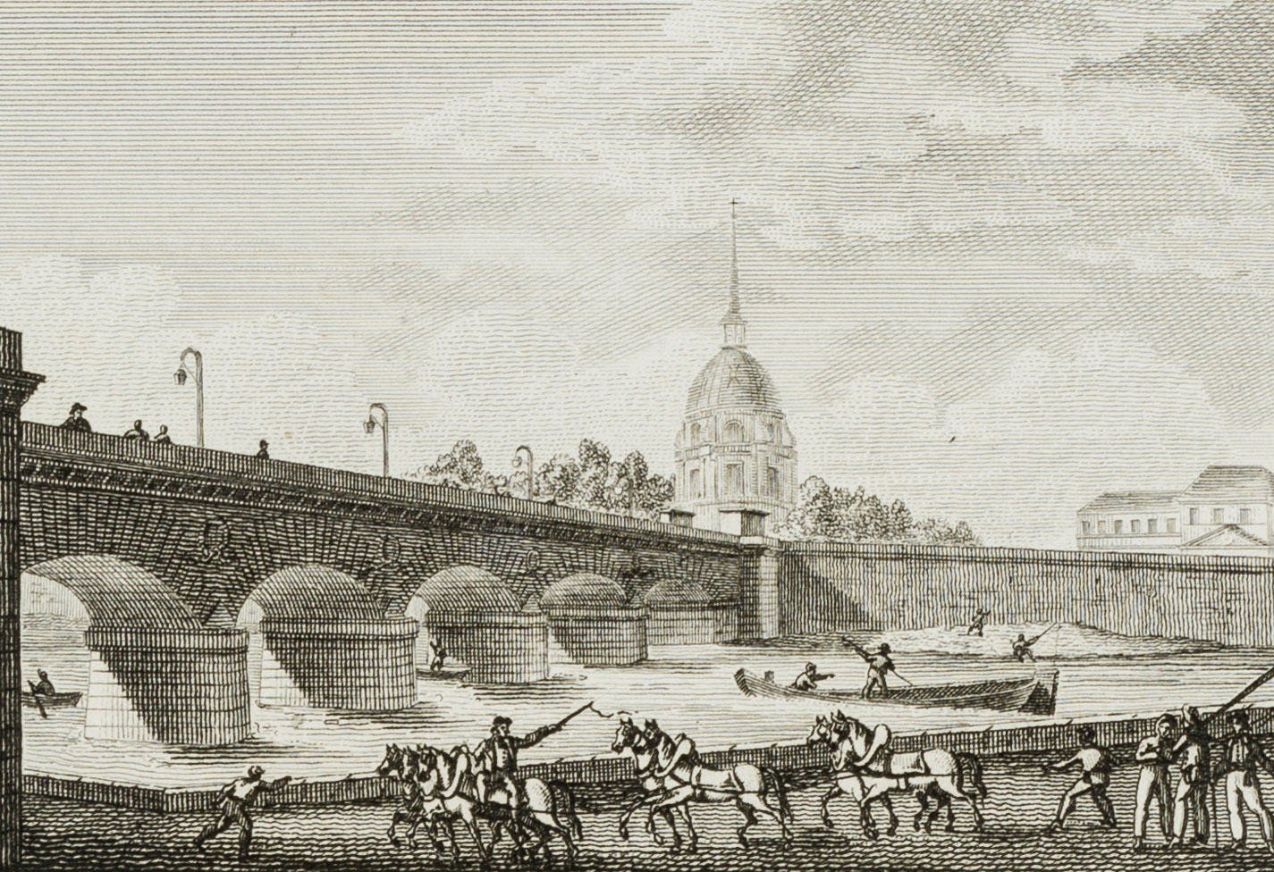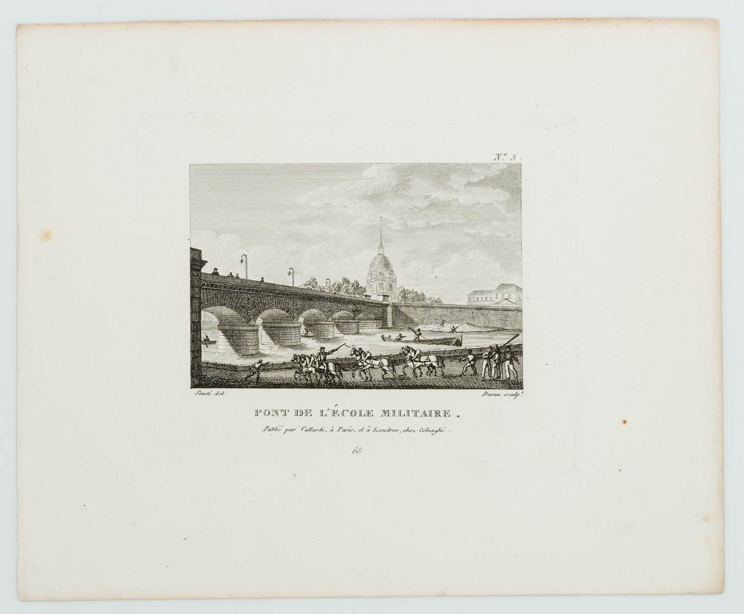 - Beschreibung: In der Druckplatte links unterhalb des Bildes signiert mit “Santi del.” und rechts mit “Durau sculp”. Mittig darunter betitelt mit “PONT DE L’ÉCOLE MILITAIRE”. Das Blatt trägt oben rechts die Nummer “5”.