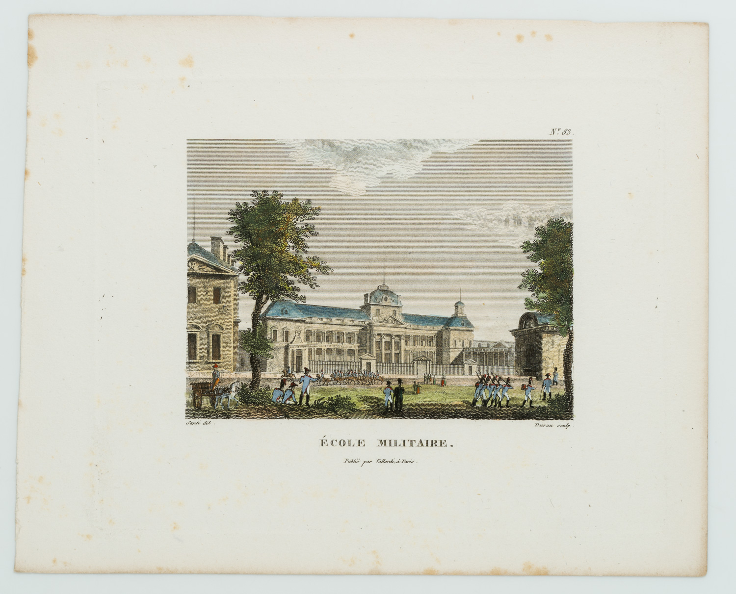 • Description: Signed “Santi del.” in the printing plate below the image on the left and “Durau sculp” on the right. Titled “ÉCOLE MILITAIRE.” in the centre below. The sheet bears the number “83” in the upper right corner.