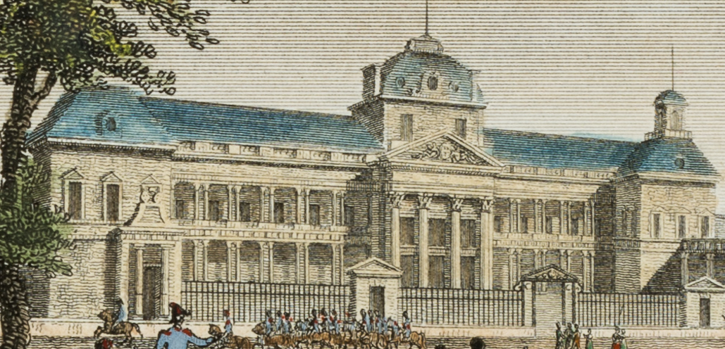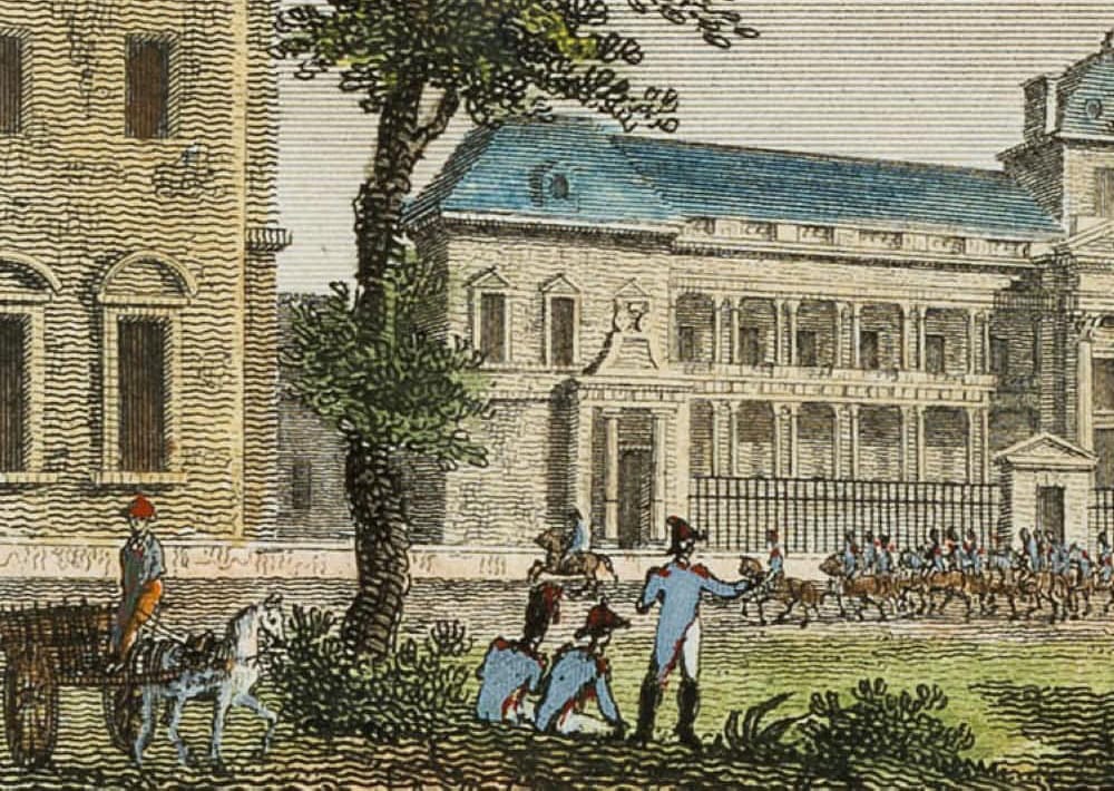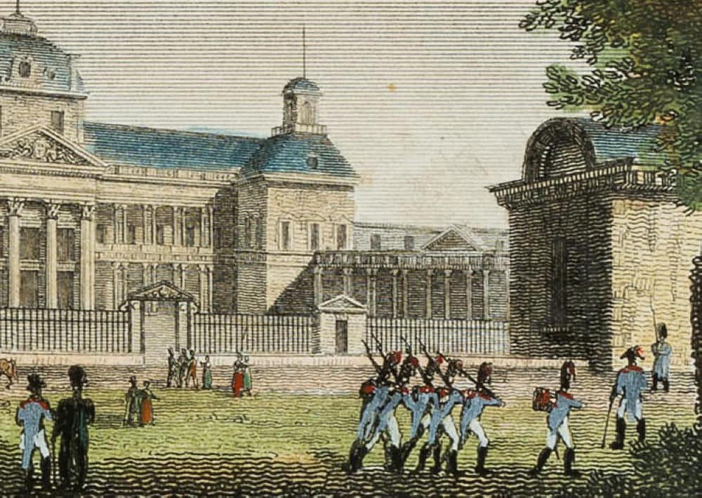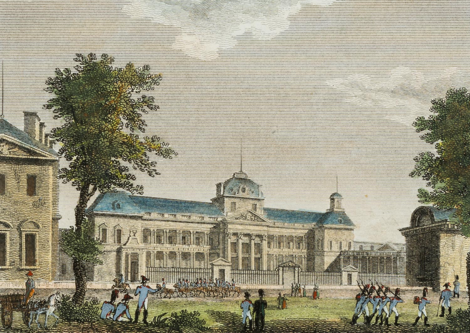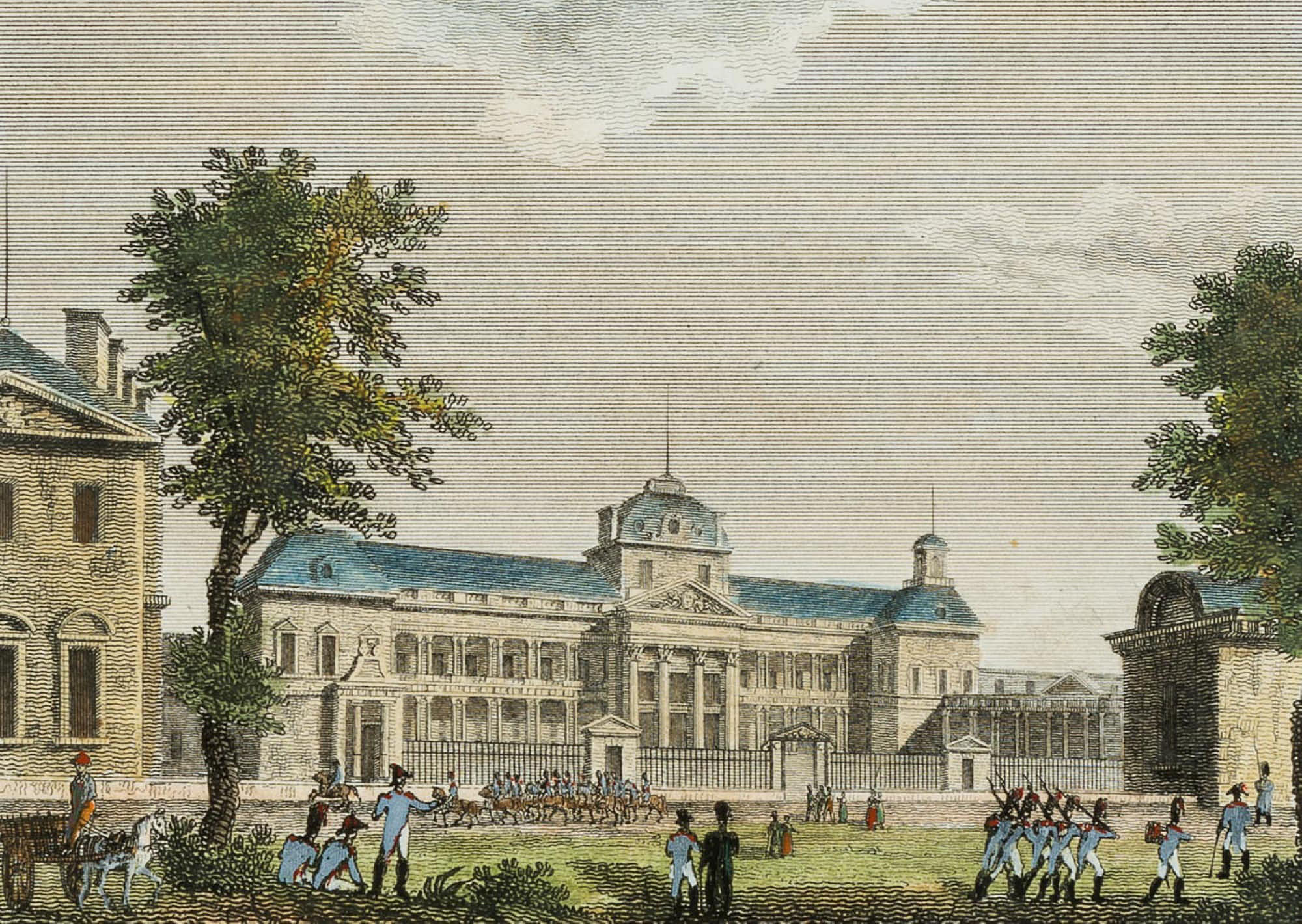 Henri Durau (19th century) after Santi (19th century), View of the military school École Militaire with patrolling Napoleonic soldiers, 19th century, Steel engraving