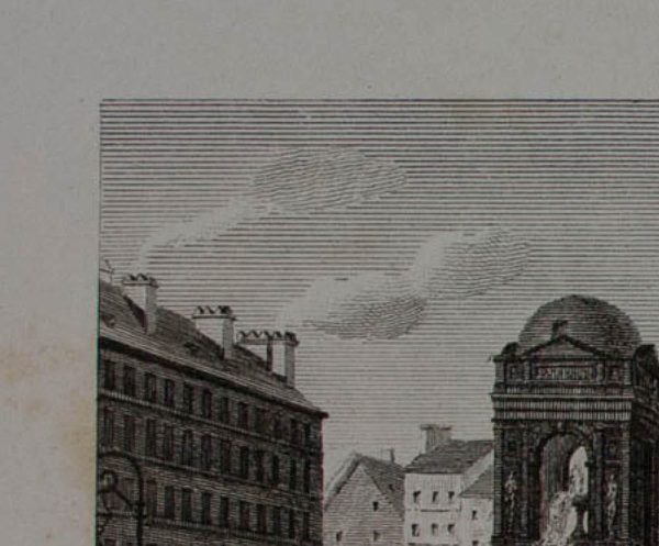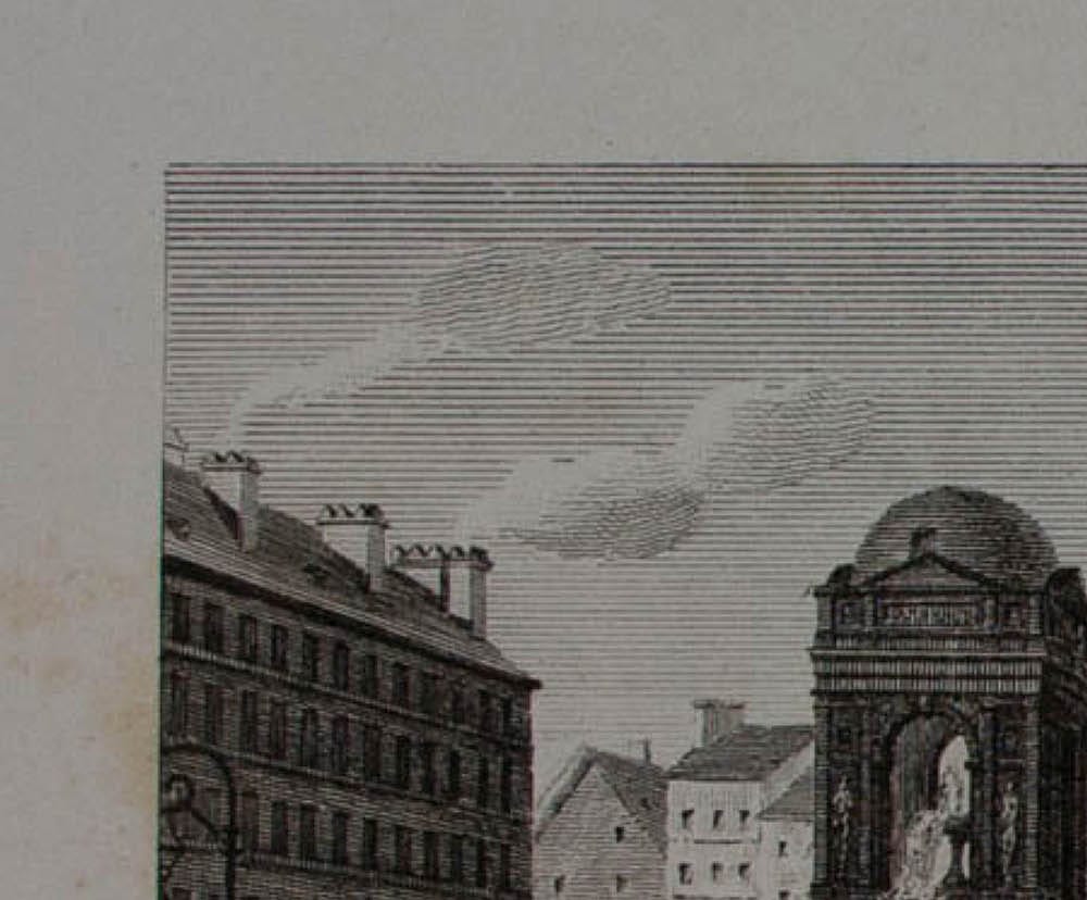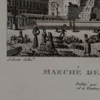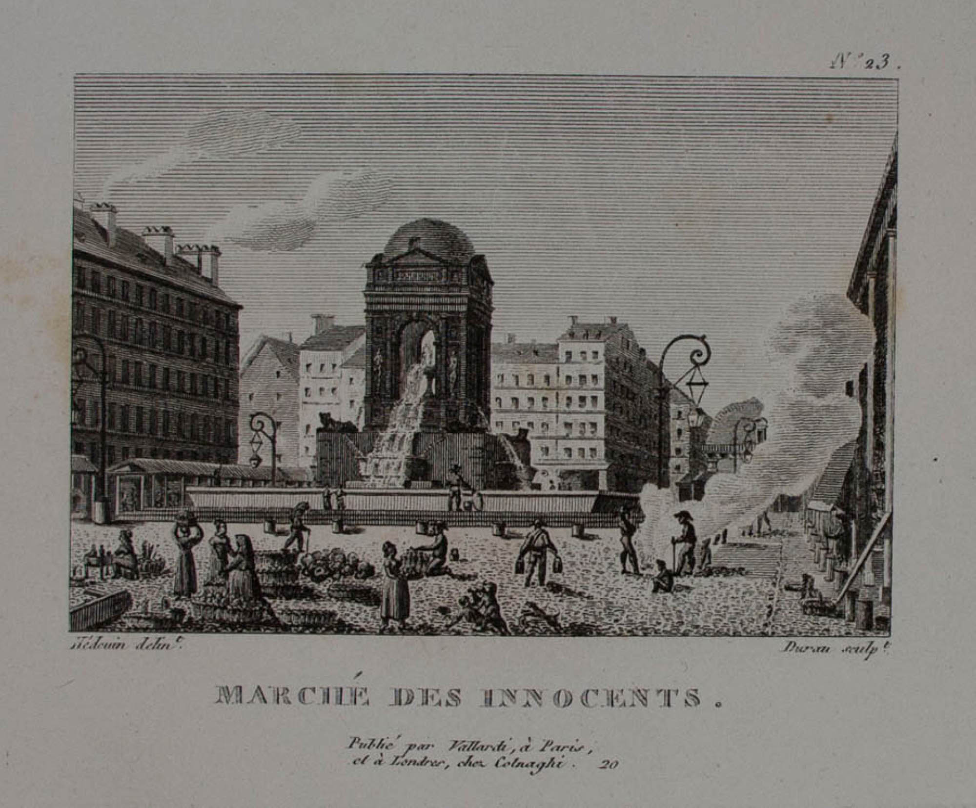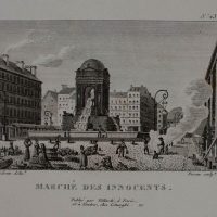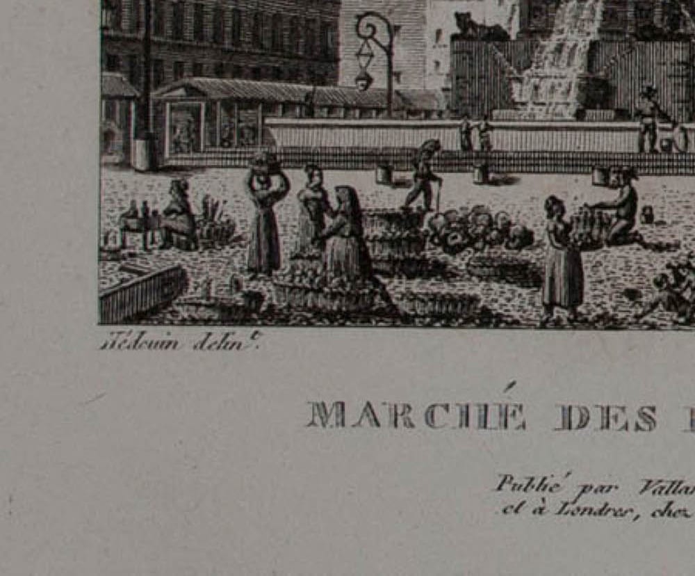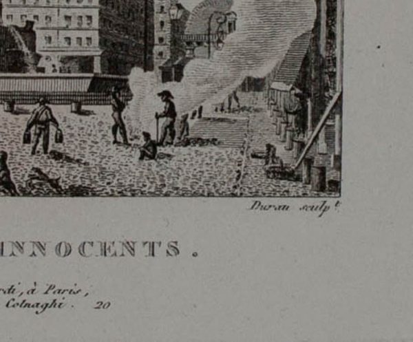 Dureau (19. Jahrhundert) nach Edmond Hédouin (1820 Boiulogne-sur-Mer – 1889 Paris), Marche des Innocents Paris, 1850, Kupferstich