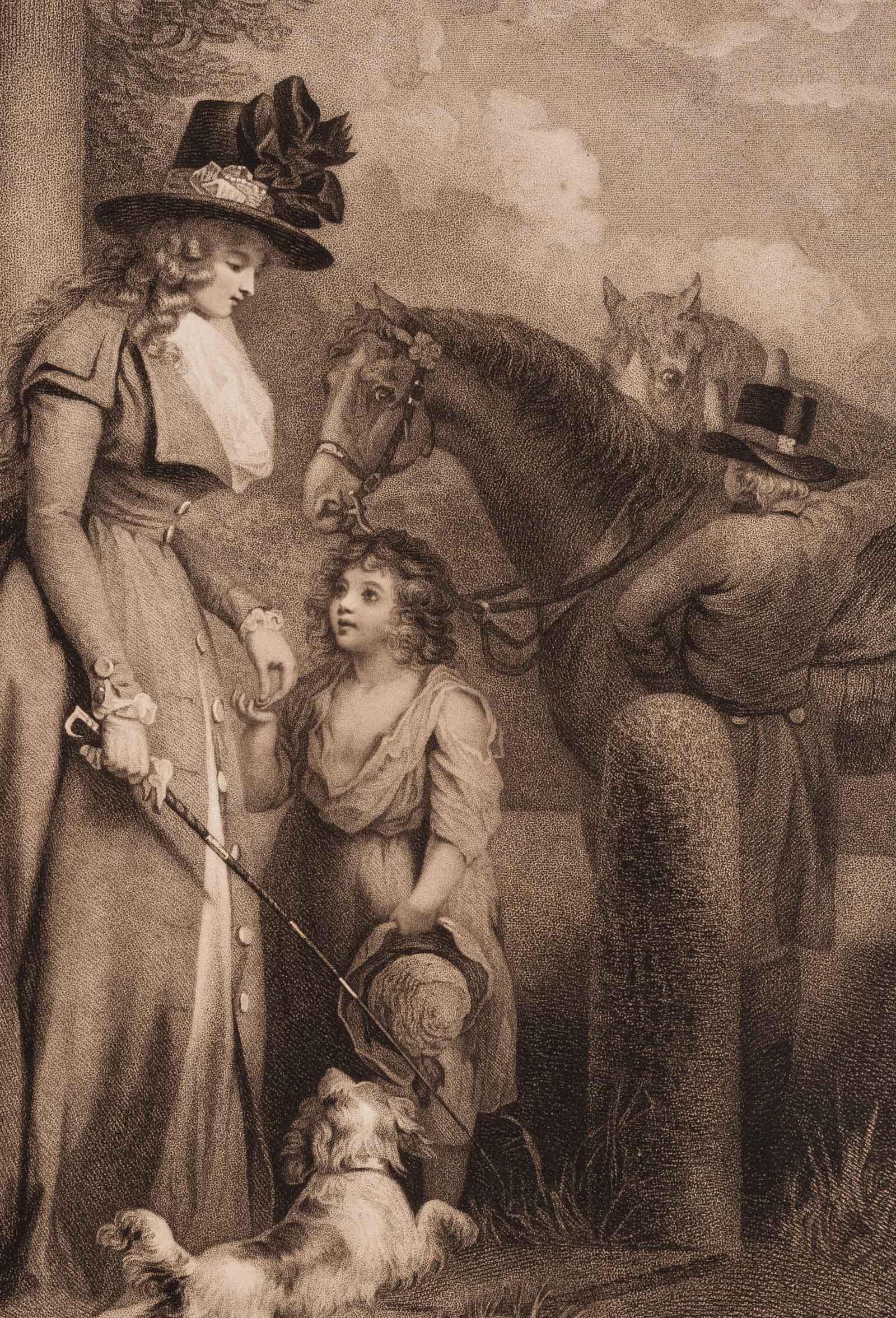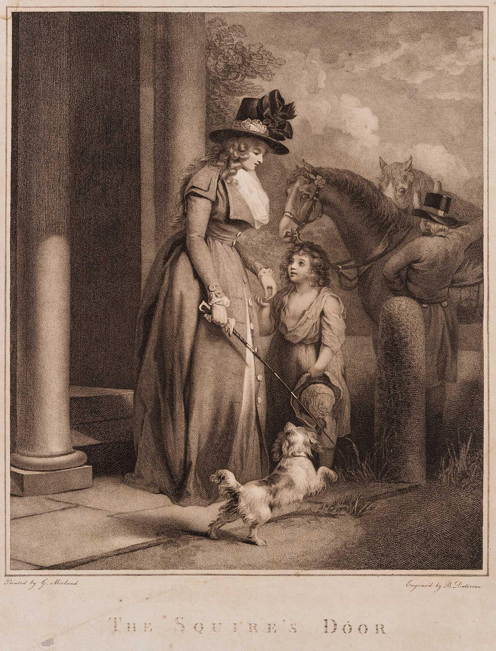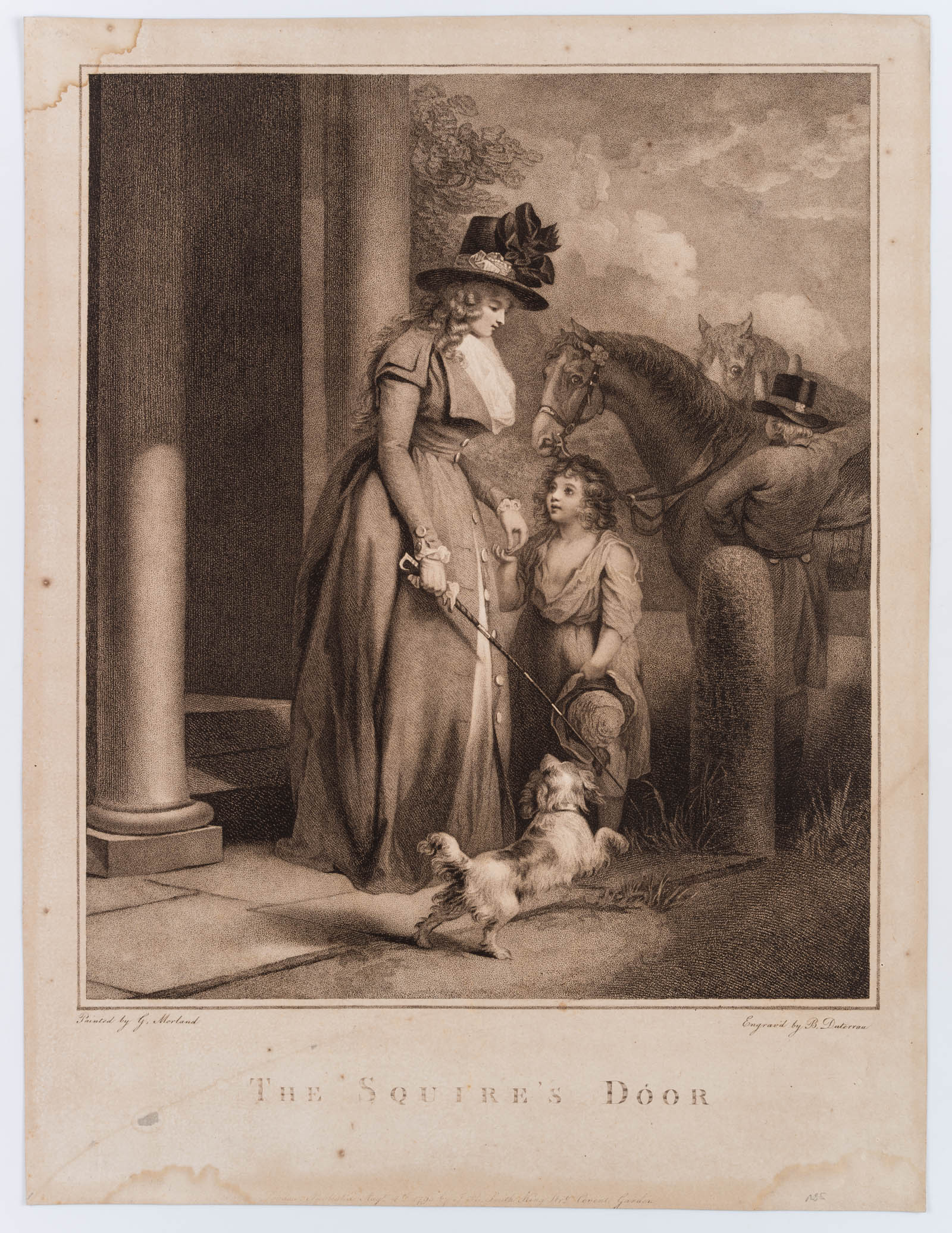 Benjamin Duterreau (1767 London – 1851 Hobart) after George Morland (1763 – 1804 ), The Squire’s Door, Squire’s Gate, Ride of a Noble Lady, 19th century, Stipple engraving