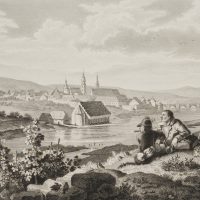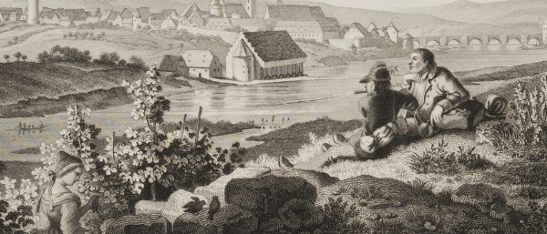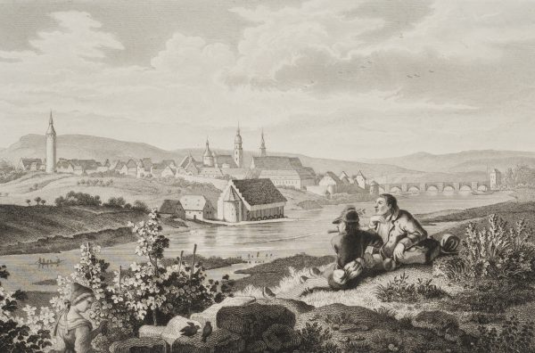 Adolf Dworzak (before 1802 – after 1838 ) after Ludwig Richter (1803 Dresden – 1884 ibid.), Veduta of Kitzingen View over the Main to the town with resting country people, c. 1840, Steel engraving