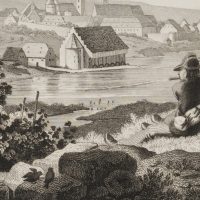 Adolf Dworzak (vor 1802 – nach 1838 ) nach Ludwig Richter (1803 Dresden – 1884 ebd.), Vedute von Kitzingen. Blick über den Main auf die Stadt mit rastenden Landleuten, um 1840, Stahlstich