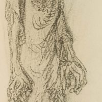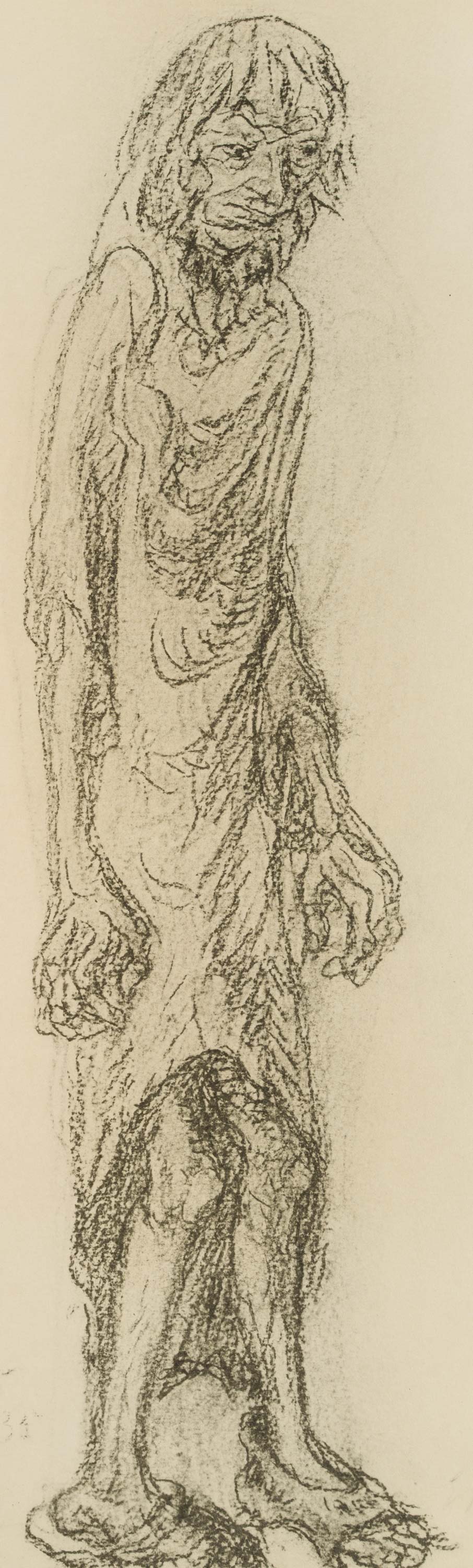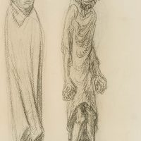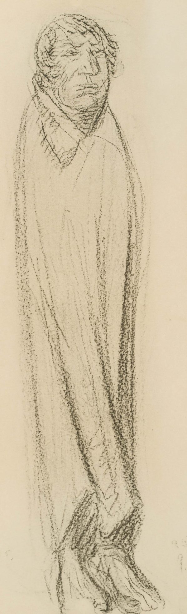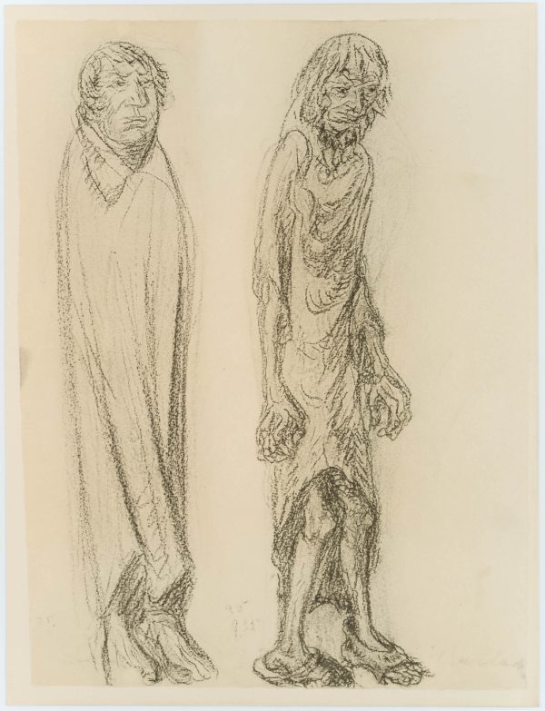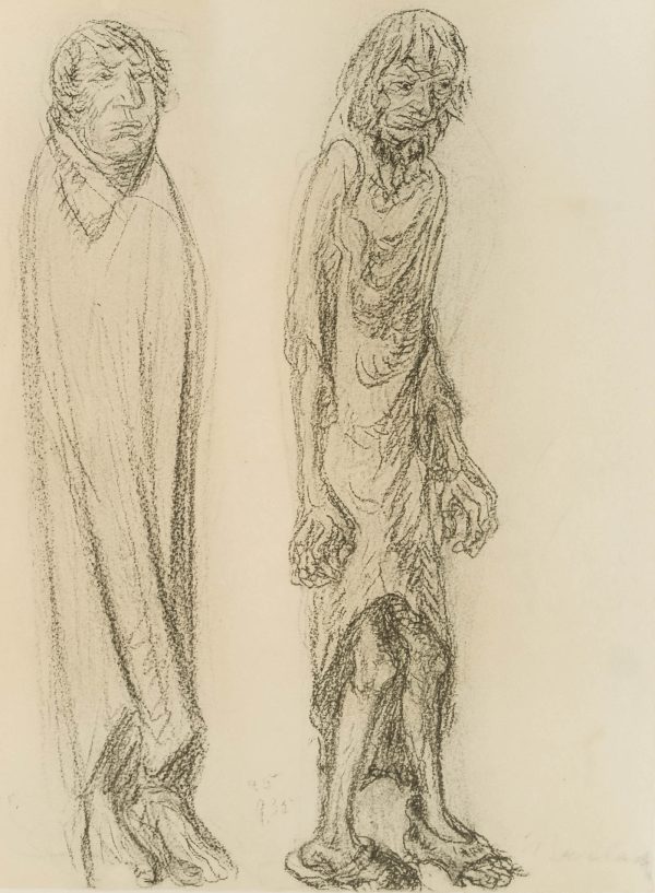 - Description: Collotype on paper. Depiction of two standing males. The figure on the left has a coat pulled tightly around him, the gesture shows a determined, slightly grumpy looking man. Contrasting with this appearance is a gaunt man to the right. A ragged cloth covers his body, the shoes on his feet are damaged, his gaze is lowered, almost appearing submissive. Ernst BARLACH is particularly famous for his sculptures and bronzes. However, numerous drawings by the artist have also come down to us, not all of which are intended to be understood as preliminary studies for a sculptural work. In the portfolio “Übungen der leichten Hand” (Exercises of the Light Hand) Barlach assembled 19 sheets showing standing figures, singly, in pairs or in small groups. The title of the portfolio has been handed down and was published in 1965 by VEB Verlag der Kunst Dresden.