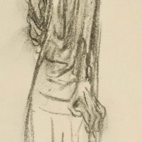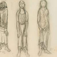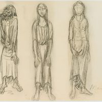 - Beschreibung: Lichtdruck auf Papier. Darstellung dreier Figuren, die allesamt in lange, fließende Gewänder gehüllt sind. Die linke Figur, ein bärtiger Mann, scheint sich in seine Finger zu beißen. Die Frauenfigur neben ihm hat ihre Augen geschlossen, die Arme hängen neben ihrem Körper herab. Die rechte Figur beschreibt der Titel als zögerlich, ihr Kopf ist gesenkt, ebenso ihr Blick. Ernst BARLACH ist besonders durch seine Plastiken und Bronzen berühmt. Daneben sind aber auch zahlreiche zeichnerische Arbeiten des Künstlers überliefert, die nicht alle als Vorstudie für eine plastische Arbeit verstanden sein wollen. In der Mappe “Übungen der leichten Hand” versammelte Barlach 19 Blätter, die Standfiguren, vereinzelt, zu zweit oder in kleinen Gruppen, zeigen. Der Titel der Mappe ist überliefert und erschien 1965 im VEB Verlag der Kunst Dresden.