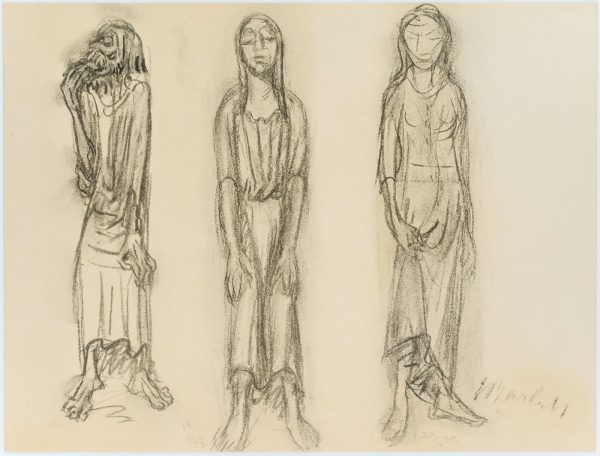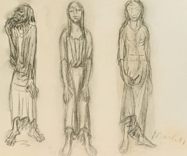 - Description: Collotype on paper. Depiction of three figures, all wrapped in long, flowing robes. The figure on the left, a bearded man, seems to be biting his fingers. The female figure next to him has her eyes closed, her arms hanging down beside her body. The title describes the right figure as hesitant, her head is lowered, as is her gaze. Ernst BARLACH is particularly famous for his sculptures and bronzes. However, numerous drawings by the artist have also survived, not all of which are intended to be understood as preliminary studies for a sculptural work. In the portfolio “Übungen der leichten Hand” (Exercises of the Light Hand) Barlach assembled 19 sheets showing standing figures, singly, in pairs or in small groups. The title of the portfolio has been handed down and was published in 1965 by VEB Verlag der Kunst Dresden.