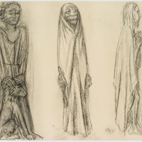 - Description: Collotype on paper. Depiction of three standing figures, wrapped in long robes. The figure on the left, a youth, seems to rest his hands on the head of a lion, which seems to be sitting in front of him. In the centre, an old man with a wrinkled face, which is covered by a kind of hood. In his right hand the man carries a rope.