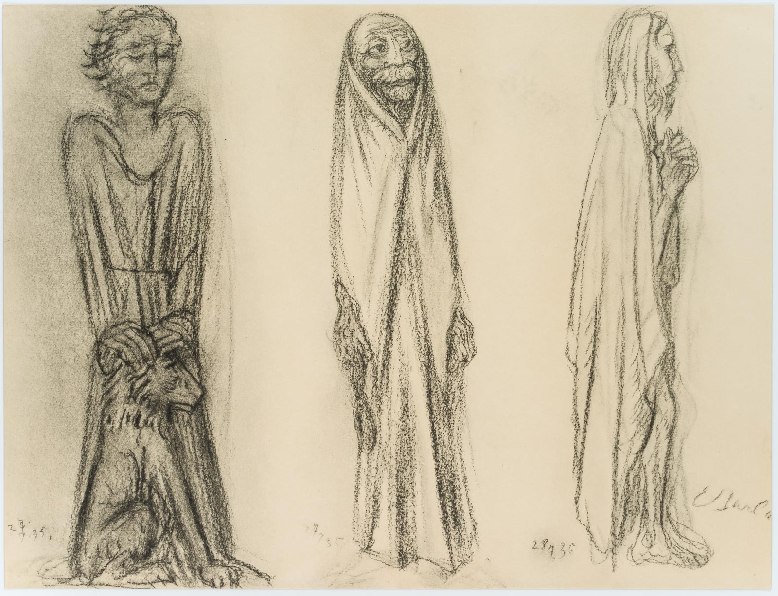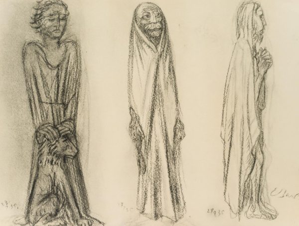 - Inscription: At the lower part inscribed in the printing plate: “EBarlach”, einzeln datiert “27.7.1935”, “28.7.1935”. On the right, another man is shown in profile, his hands folded in prayer.
