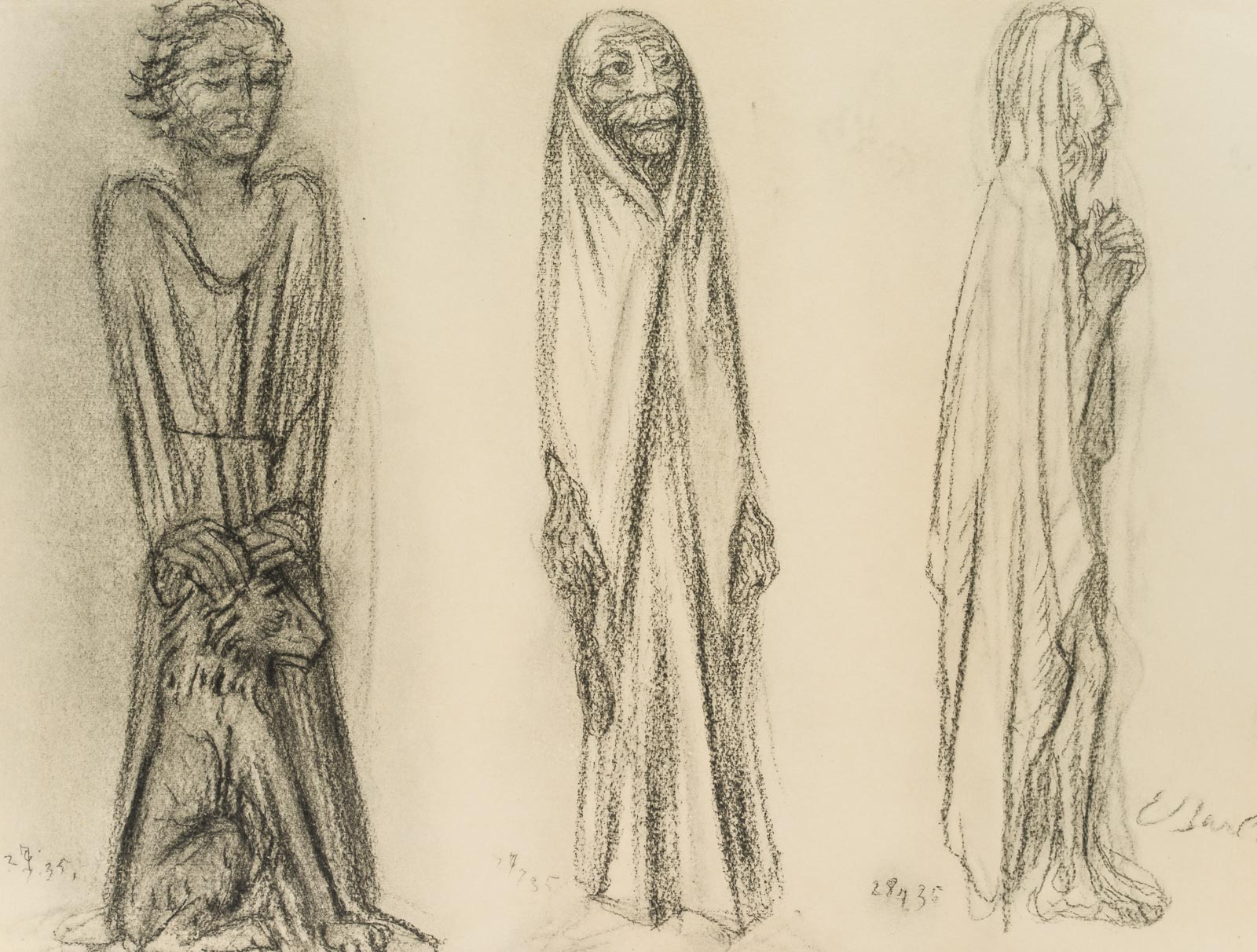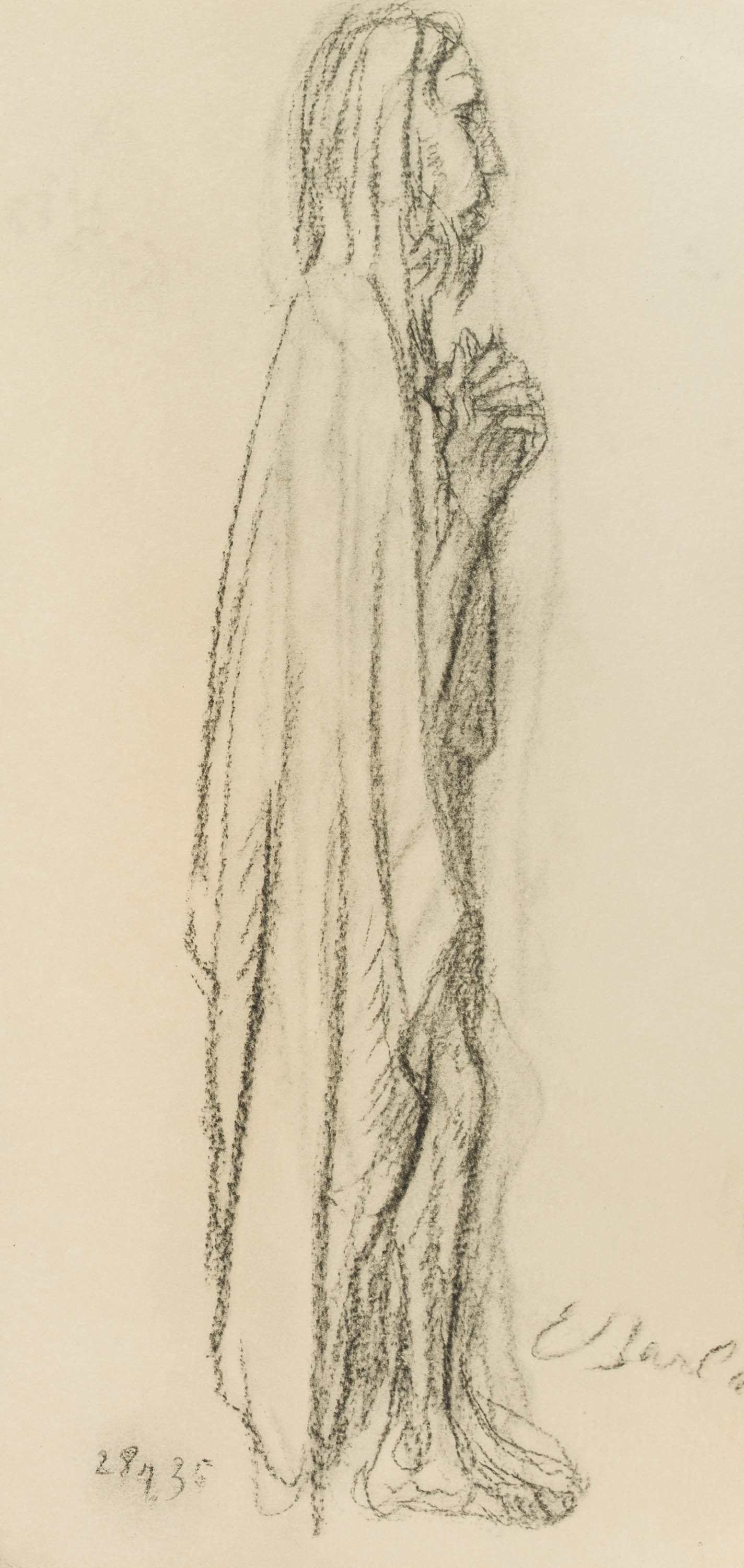- Bezeichnung: Unten im Druck bezeichnet: “EBarlach”, einzeln datiert “27.7.1935”, “28.7.1935”. Rechts im Profil dargestellt ein weiterer Mann, die Hände zum Gebet gefaltet.