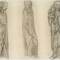 - Description: Collotype on paper. Depiction of three standing figures, wrapped in long robes. The female figure on the left, wearing a gathered and partly translucent dress, is turned towards the other two figures. In the centre a woman, a shawl wrapped tightly around her body, sitting on a ledge.