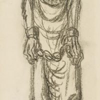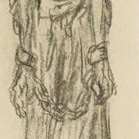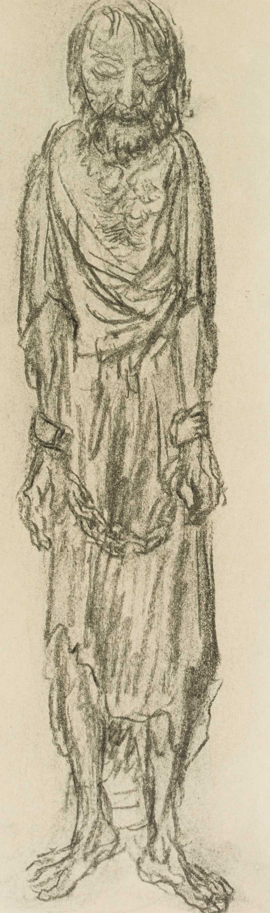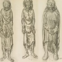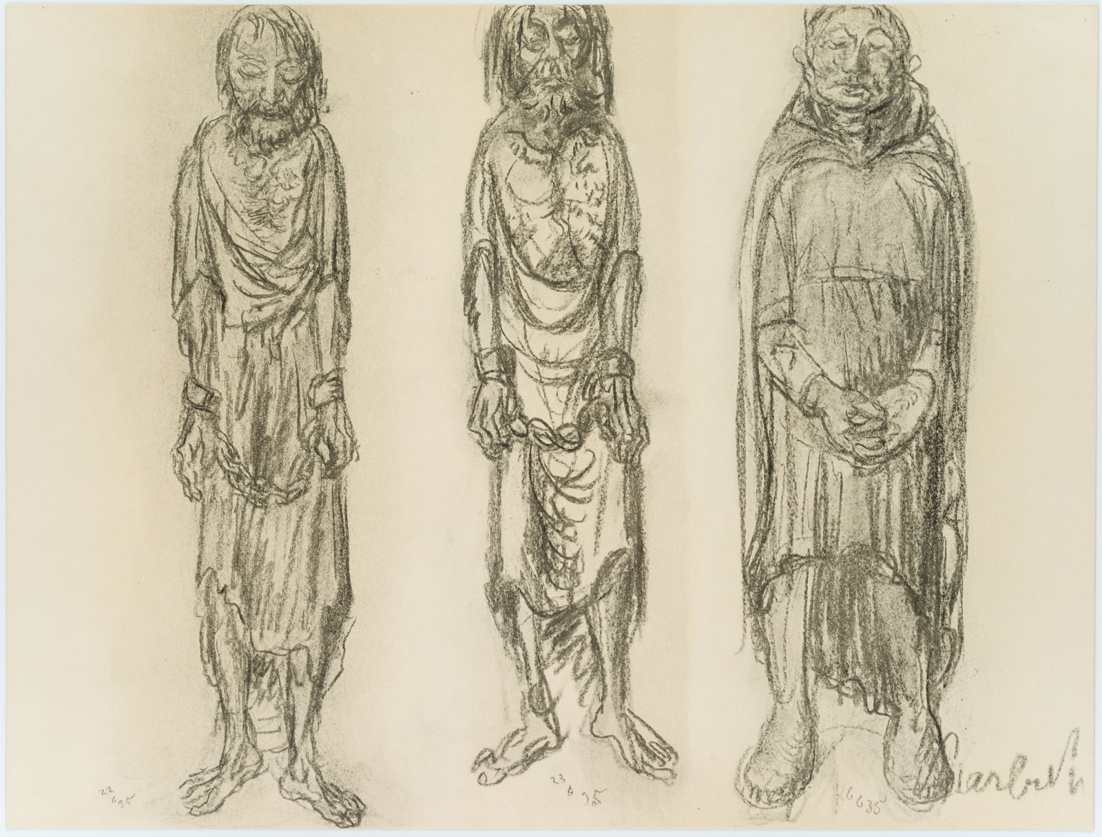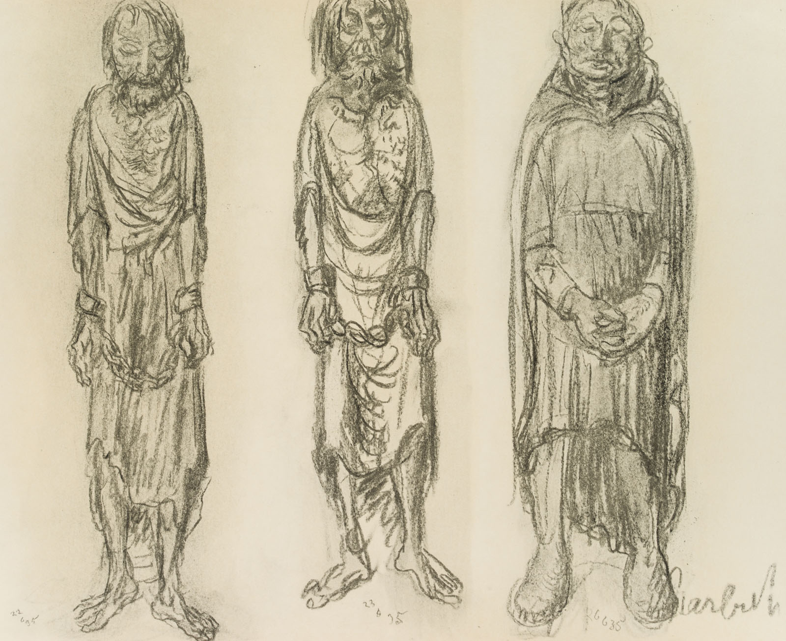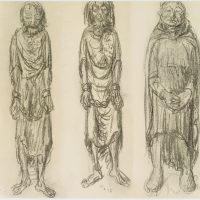 - Description: Collotype on paper. Depiction of three figures, all wrapped in long flowing robes. The figure on the left and in the middle wear heavy iron chains around their hands, the robe hangs in tatters, their feet are barefoot. The figure on the right holds her hands clasped, almost submissively looking down at the ground. Ernst BARLACH is particularly famous for his sculptures and bronzes. However, numerous drawings by the artist have also come down to us, not all of which are intended to be understood as preliminary studies for a sculptural work. In the portfolio “Übungen der leichten Hand” (Exercises of the Light Hand) Barlach assembled 19 sheets showing standing figures, singly, in pairs or in small groups. The title of the portfolio has been handed down and was published in 1965 by VEB Verlag der Kunst Dresden.
