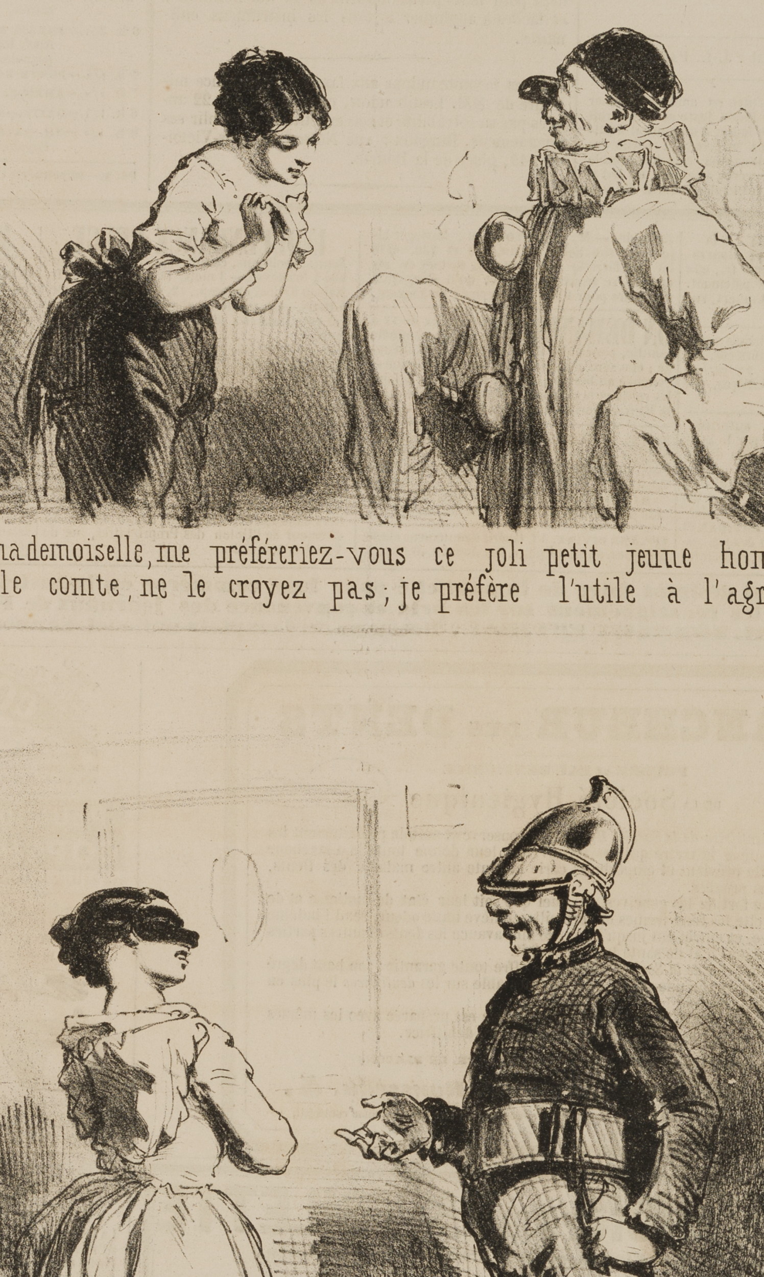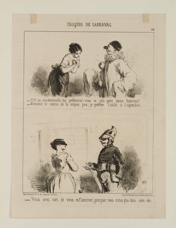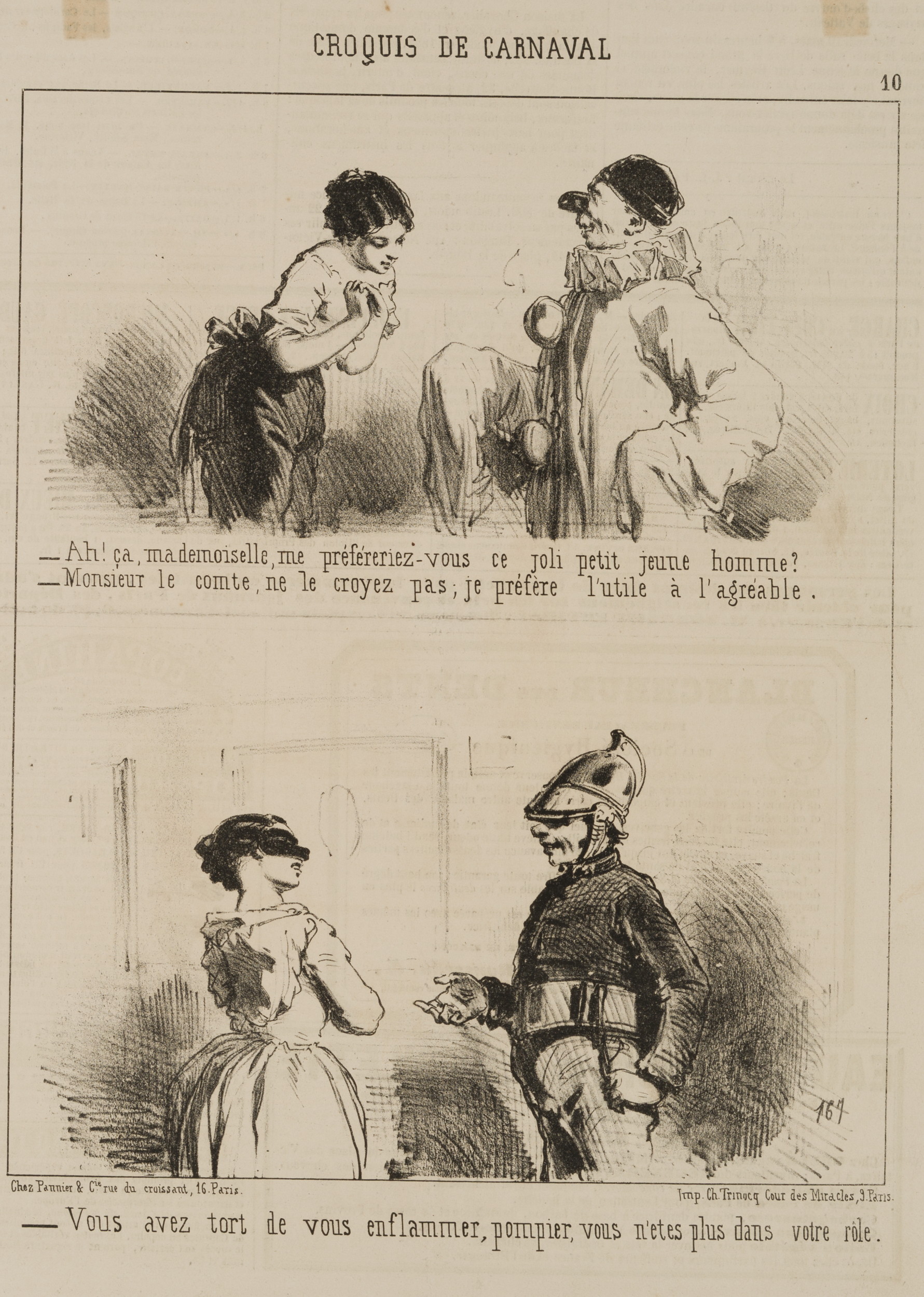 Two caricatures on one sheet – caption. Translated from the French: [1]- Ah yes, Miss, would you prefer this handsome young man to me? – Count, even if you don’t believe it, I prefer the useful to the pleasant. [2] You shouldn’t get too excited, fireman, otherwise you’ll fall out of character. - Verso: Typographic printing, advertisements