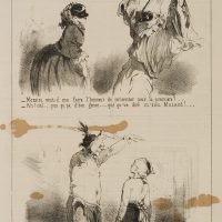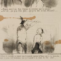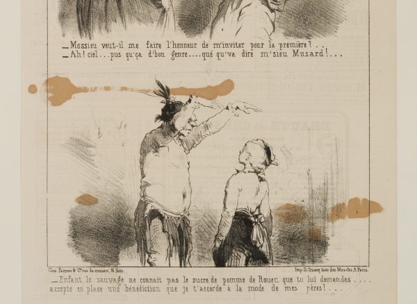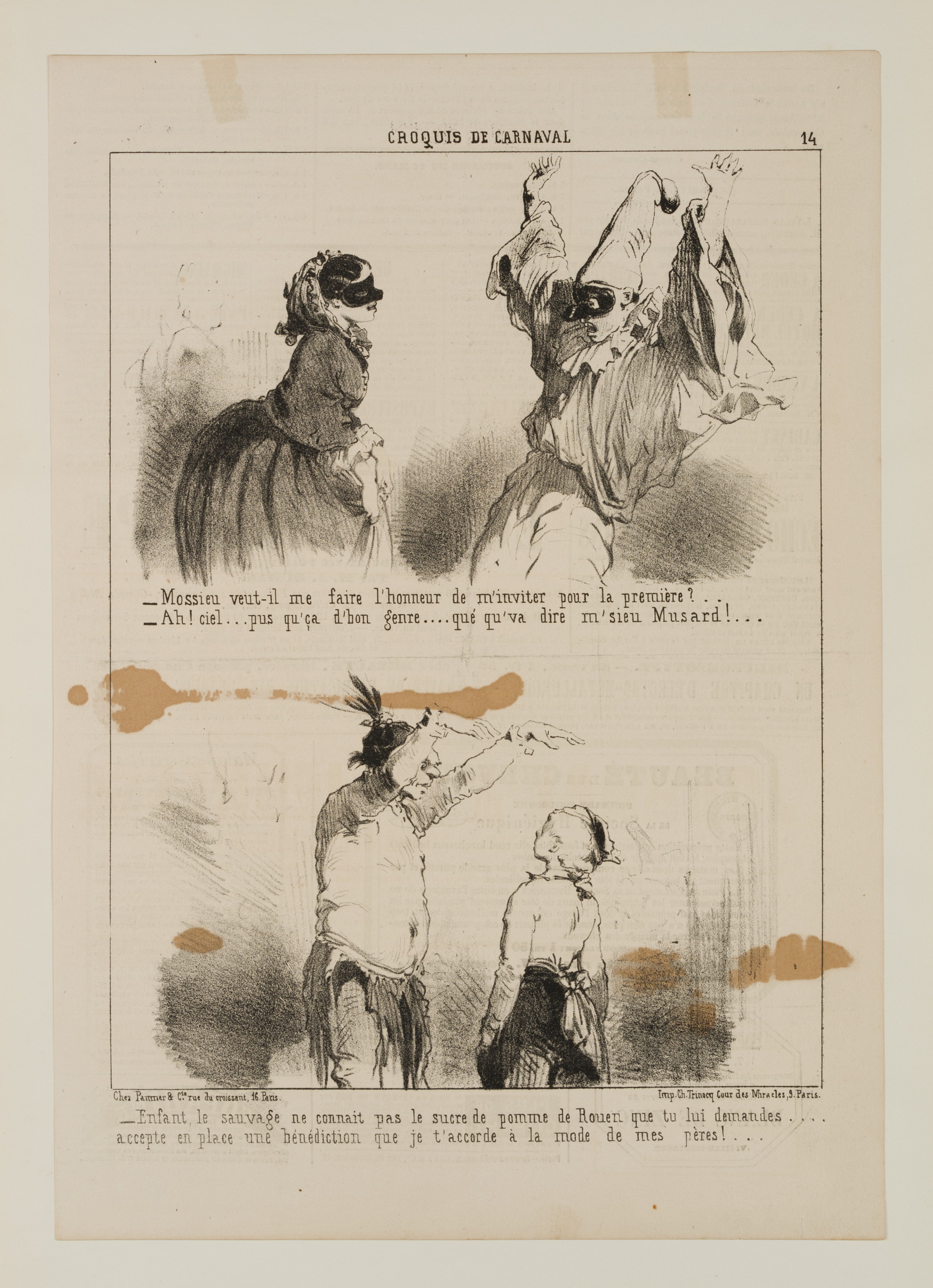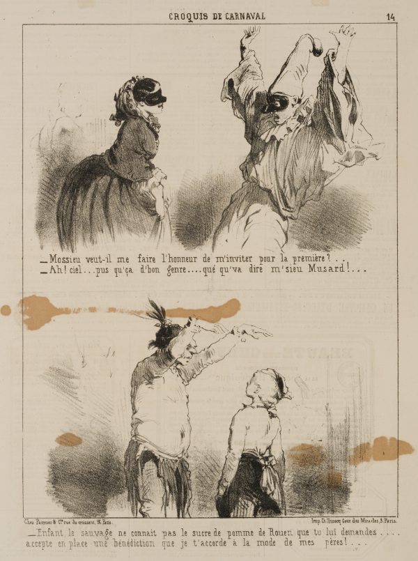 Two caricatures on one sheet – Captioned: [1] -Mossieu veut-il me faire l’honneur de m’inviter pour la premiere? -Ah! ciel …pus qu’ca d’bon genre…qué qu’va dire m’sieu Musard [2] – Child the savage does not know the apple sugar from Rouen you ask him for …. accept this in lieu of a blessing I bestow on you after the manner of my fathers - Source: Le Charivari | Magazine, Genre, Politics
