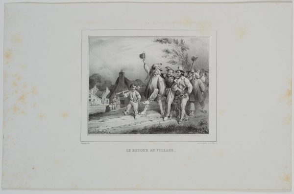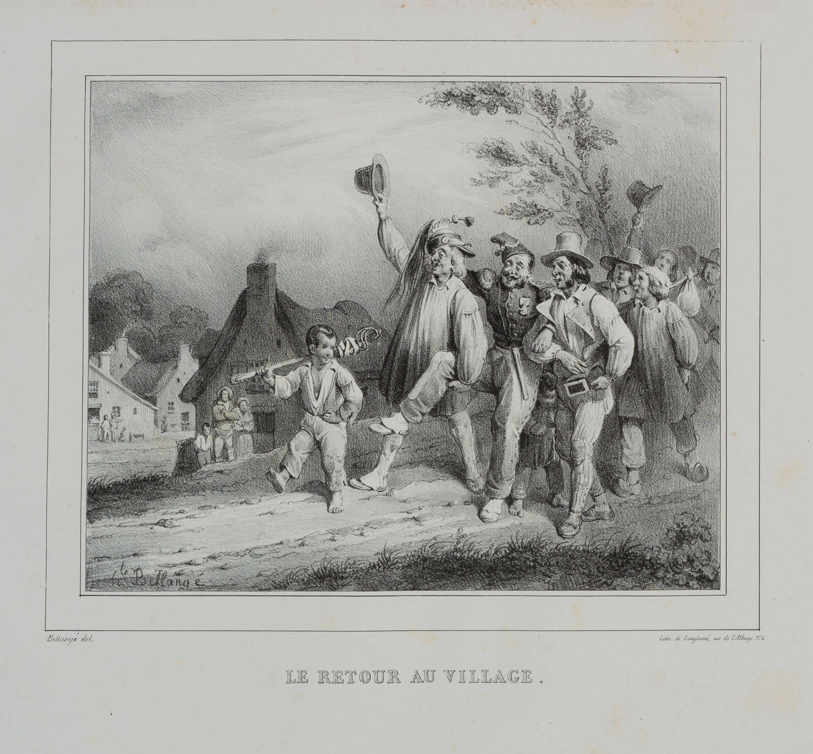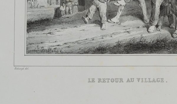 - Description: Eugne Bellange (1837-1895), Le Retour au Village, The Return to the Village, Lithograph de Langlum rue d L’Abbaye No 4, Signed and inscribed. 1880/1900, Lithograph. Happy soldiers return to their home village.