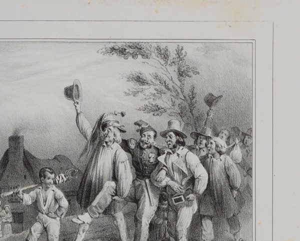 - Beschreibung: Eugène Bellange (1837-1895), Le Retour au Village, Die Rückkehr ins Dorf, Lithographie de Langlumé rue d L’Abbaye No 4, Signiert und bezeichnet. 1880/1900, Lithographie. Fröhliche Soldaten kehren in ihr Heimatdorf zurück.