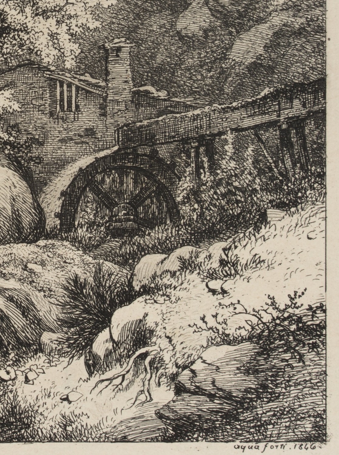 - Bezeichnung: Unterhalb der Darstellung in der Druckplatte bezeichnet, signiert und datiert: “E Bléry del et sculpt”, “Mouloin pres d’Ally en Savoye” und “aqua forti 1846”