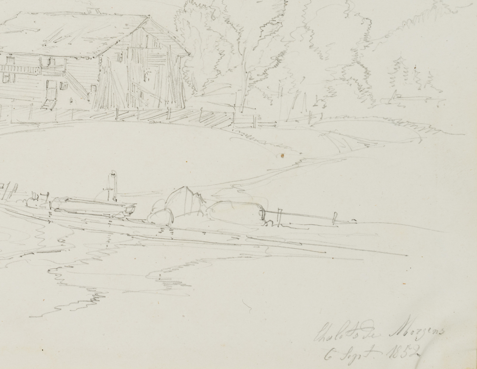 Edmond de Bretenières (1804 Dijon – 1882 ebd.), Almhütte “Chalet de Morgens”, vermutlich nahe des Flusstales der Morges im Kanton Waadt, Reise in die Schweiz, Skizzenbuch, 1852, Bleistift