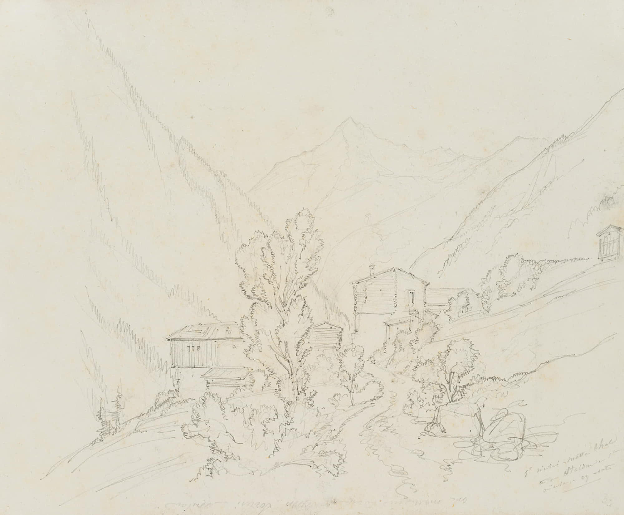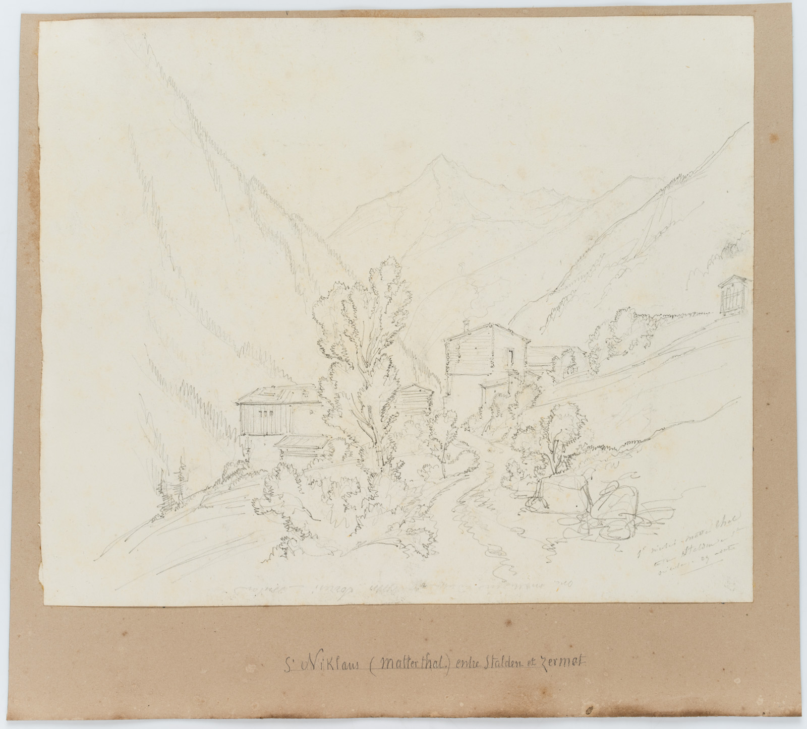 Edmond de Bretenières (1804 Dijon – 1882 ibid.), View of St Niklaus (Zaniglas) in the Matter valley near Stalden and Zermatt in the canton of Valais, Journey to Switzerland, Sketchbook, 19th century, Pencil