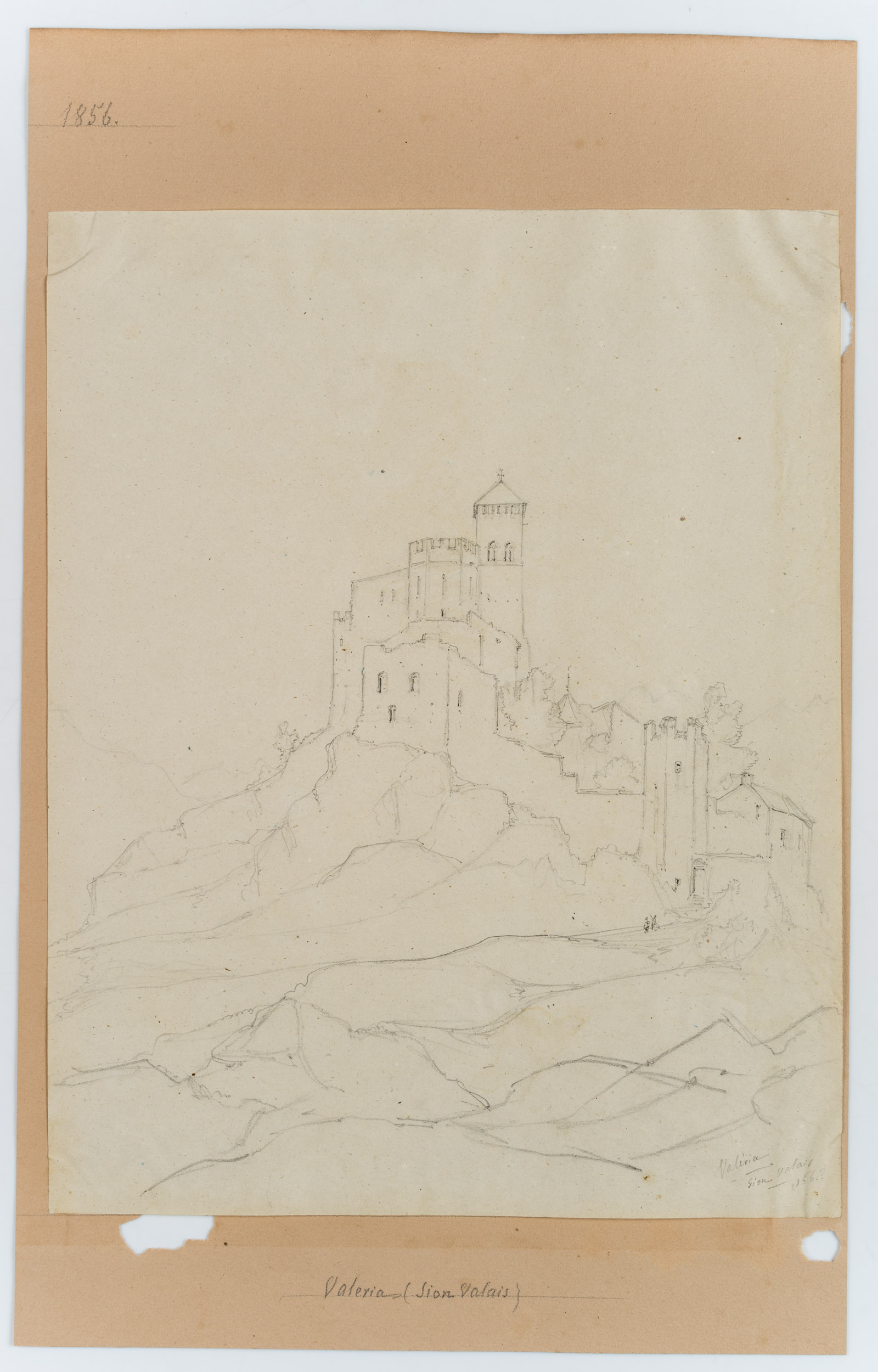 Edmond de Bretenières (1804 Dijon – 1882 ebd.), Basilique de Valère in Sion, Basilika von Valeria, Schloss und Basilika auf felsigem Hügel in Sitten (Sion) im Kanton Wallis, Reise in die Schweiz, Skizzenbuch, 1856, Bleistift