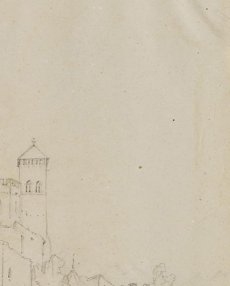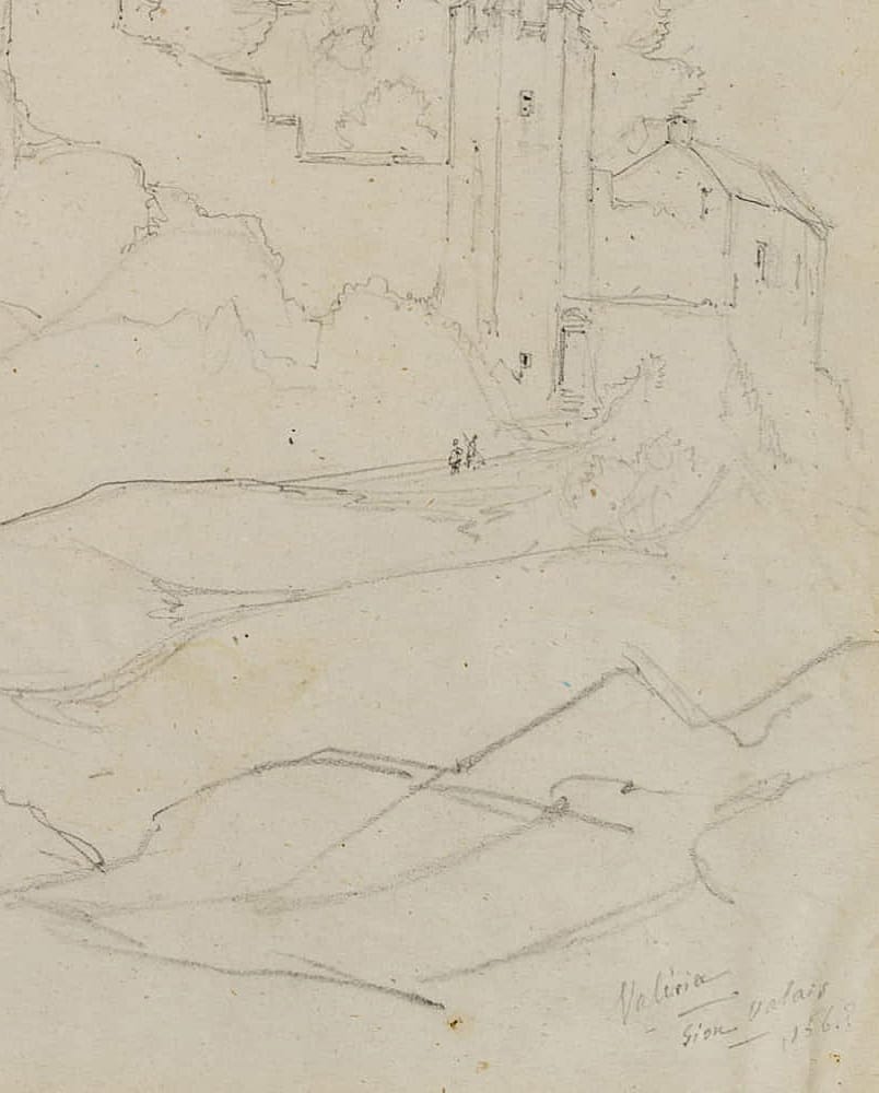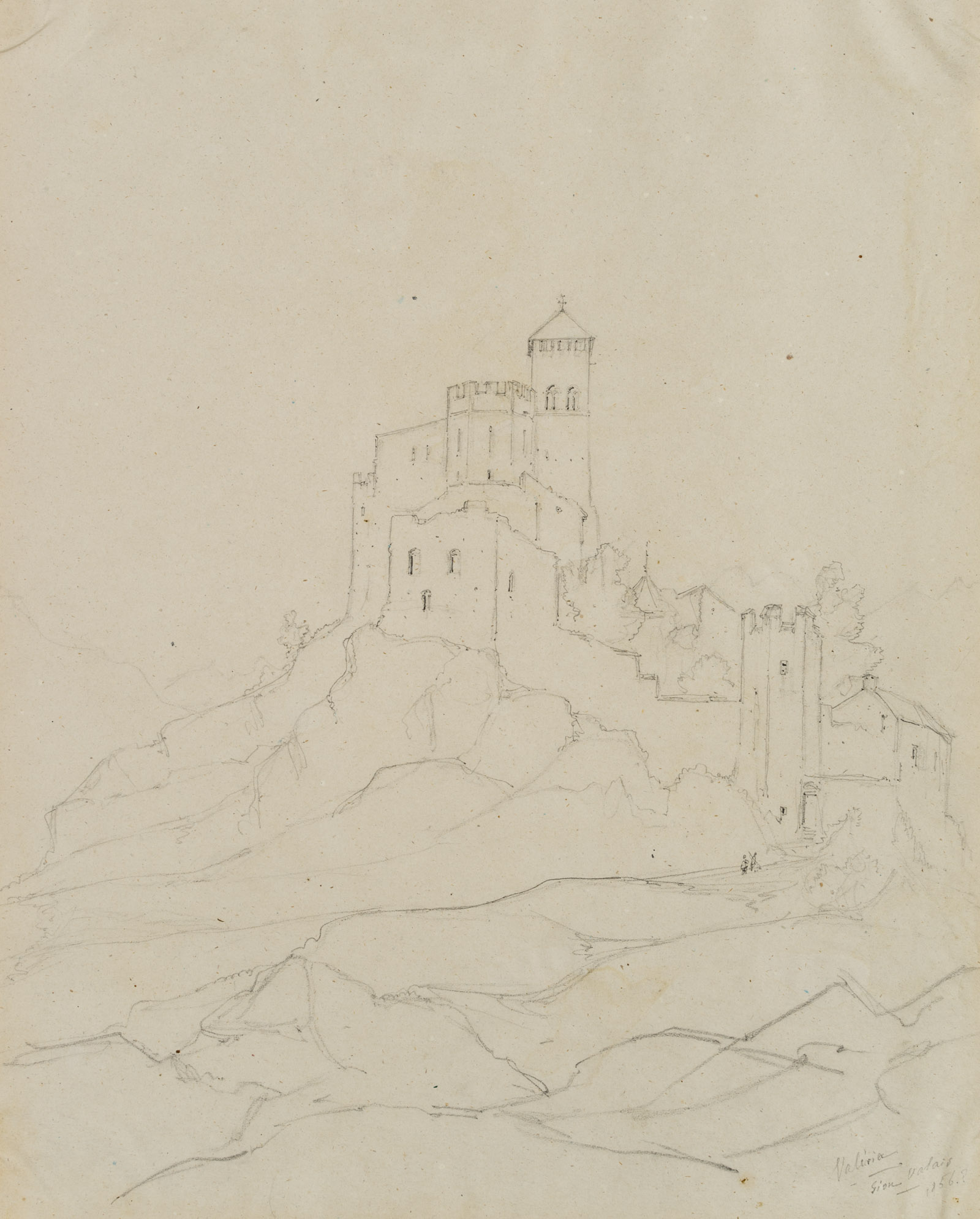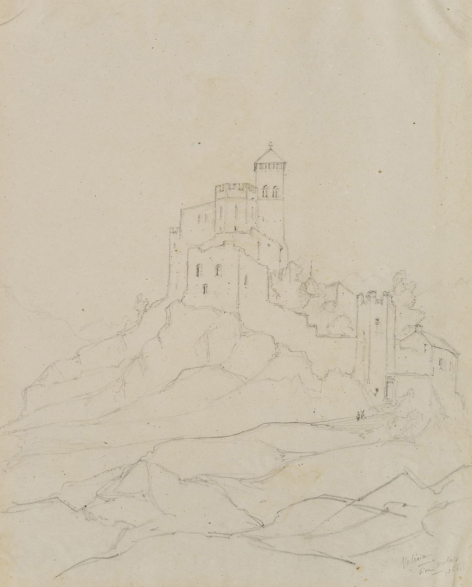 Edmond de Bretenières (1804 Dijon – 1882 ibid.), Basilique de Valère in Sion, Basilica of Valeria, Castle and basilica on rocky hill in Sitten (Sion) in the canton of Valais, Trip to Switzerland, Sketchbook, 1856, Pencil