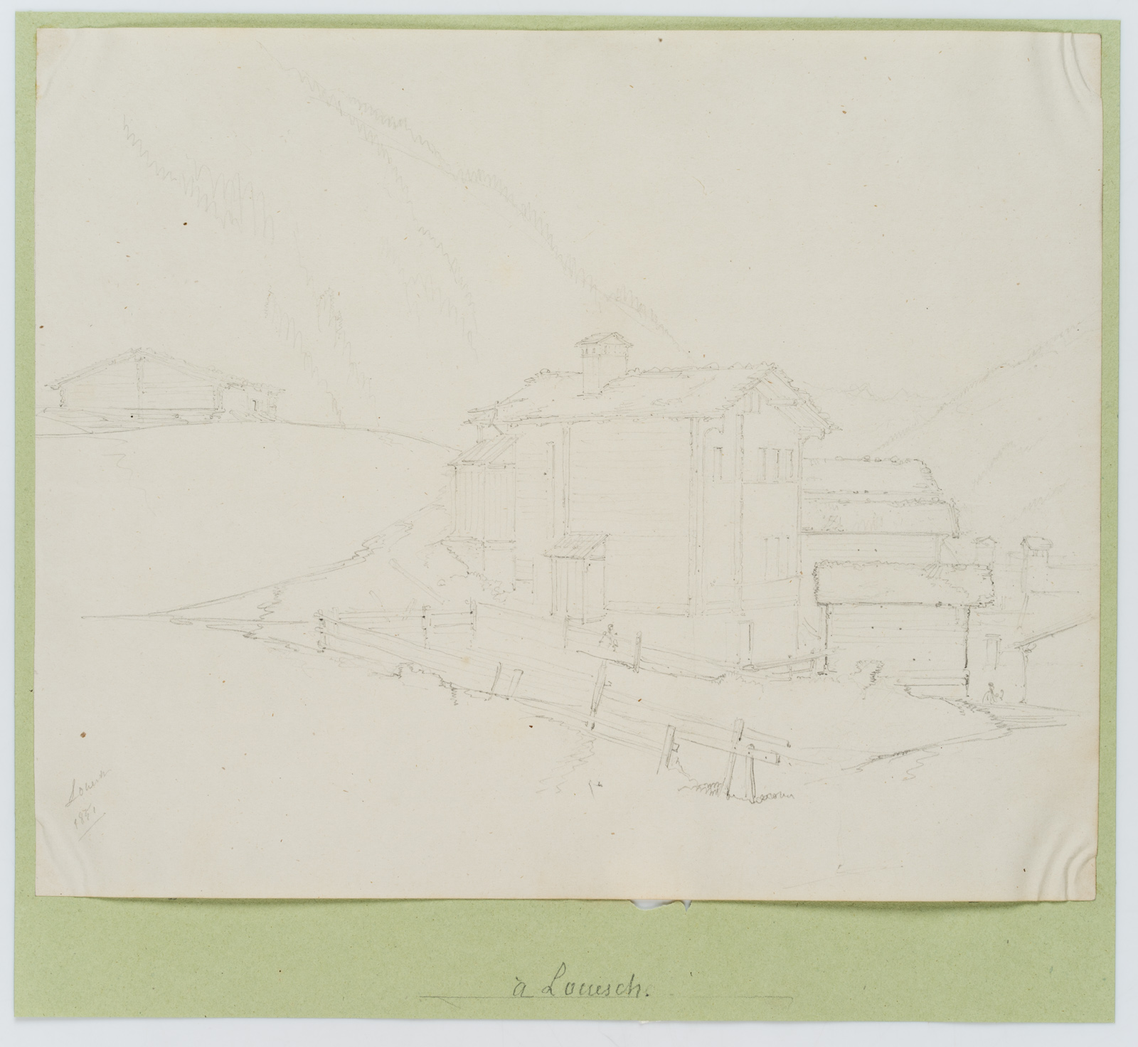 Edmond de Bretenières (1804 Dijon – 1882 ebd.), Berghöfe oder Gasthäuser bei Leuk im Kanton Wallis, Loéche, Leigg, “Louesch”, Reise in die Schweiz, Skizzenbuch, 1851, Bleistift