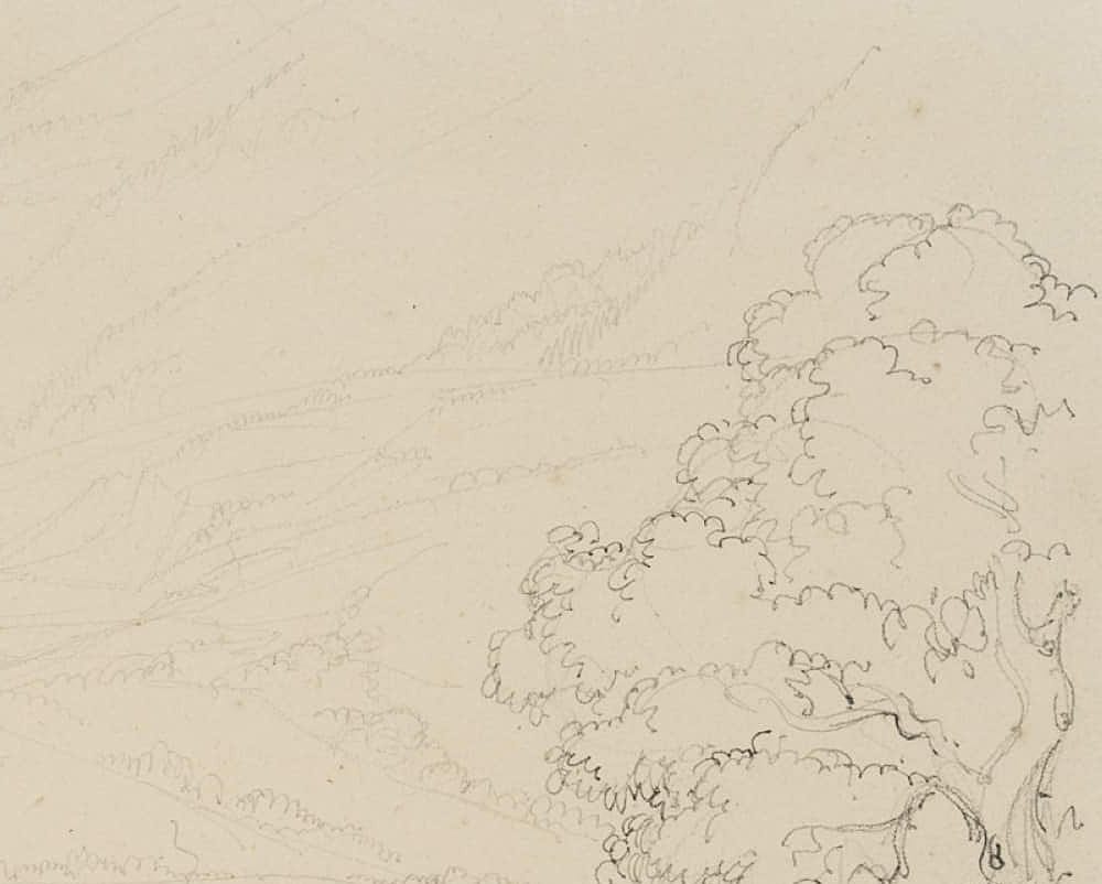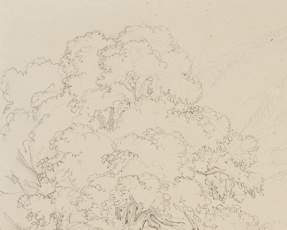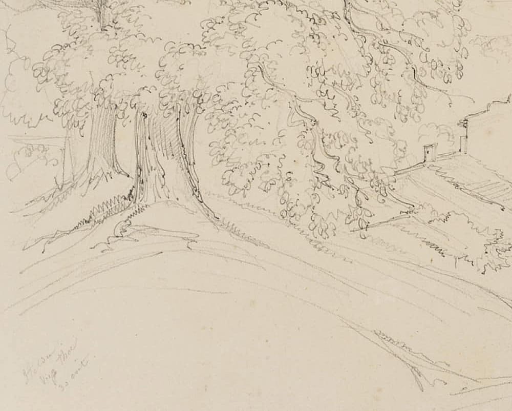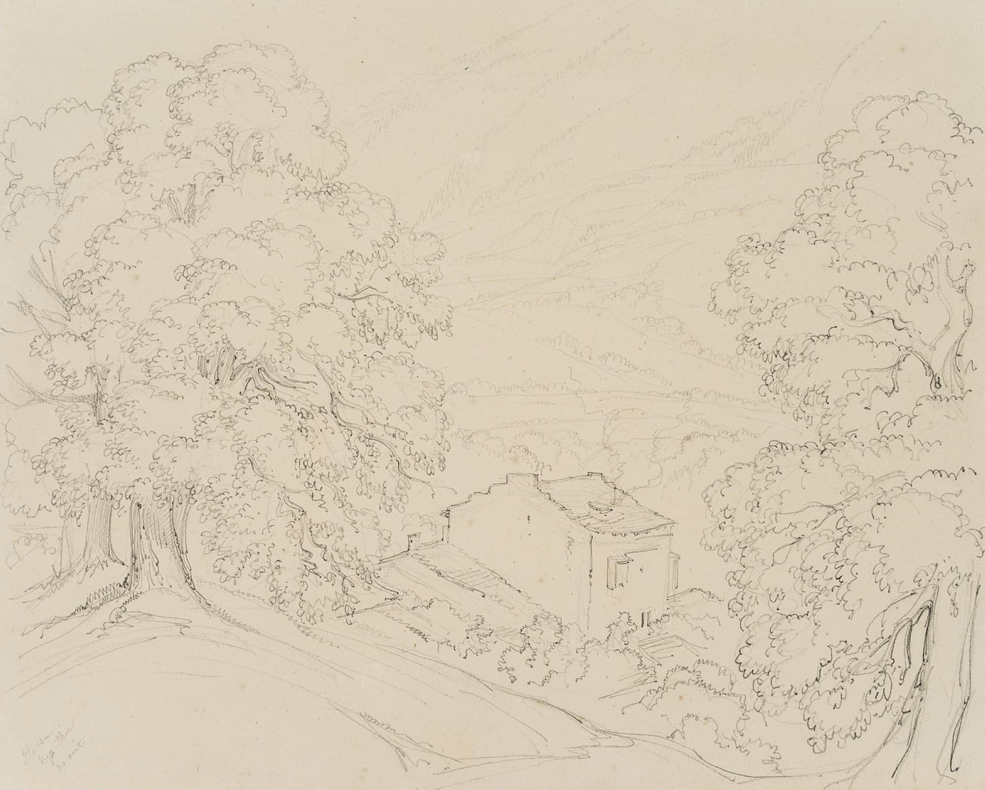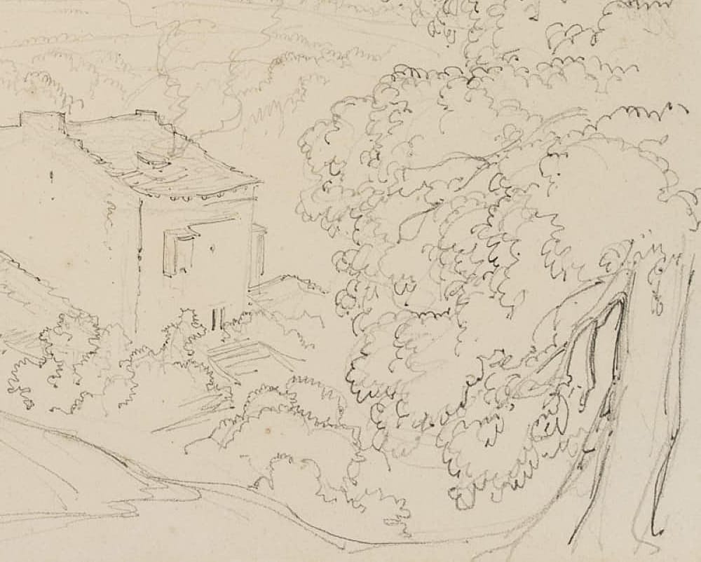 Edmond de Bretenières (1804 Dijon – 1882 ebd.), Blick aus dem Wald über ein Haus in Stalden im Vispertal im Kanton Wallis, Reise in die Schweiz, Skizzenbuch, 1838, Bleistift