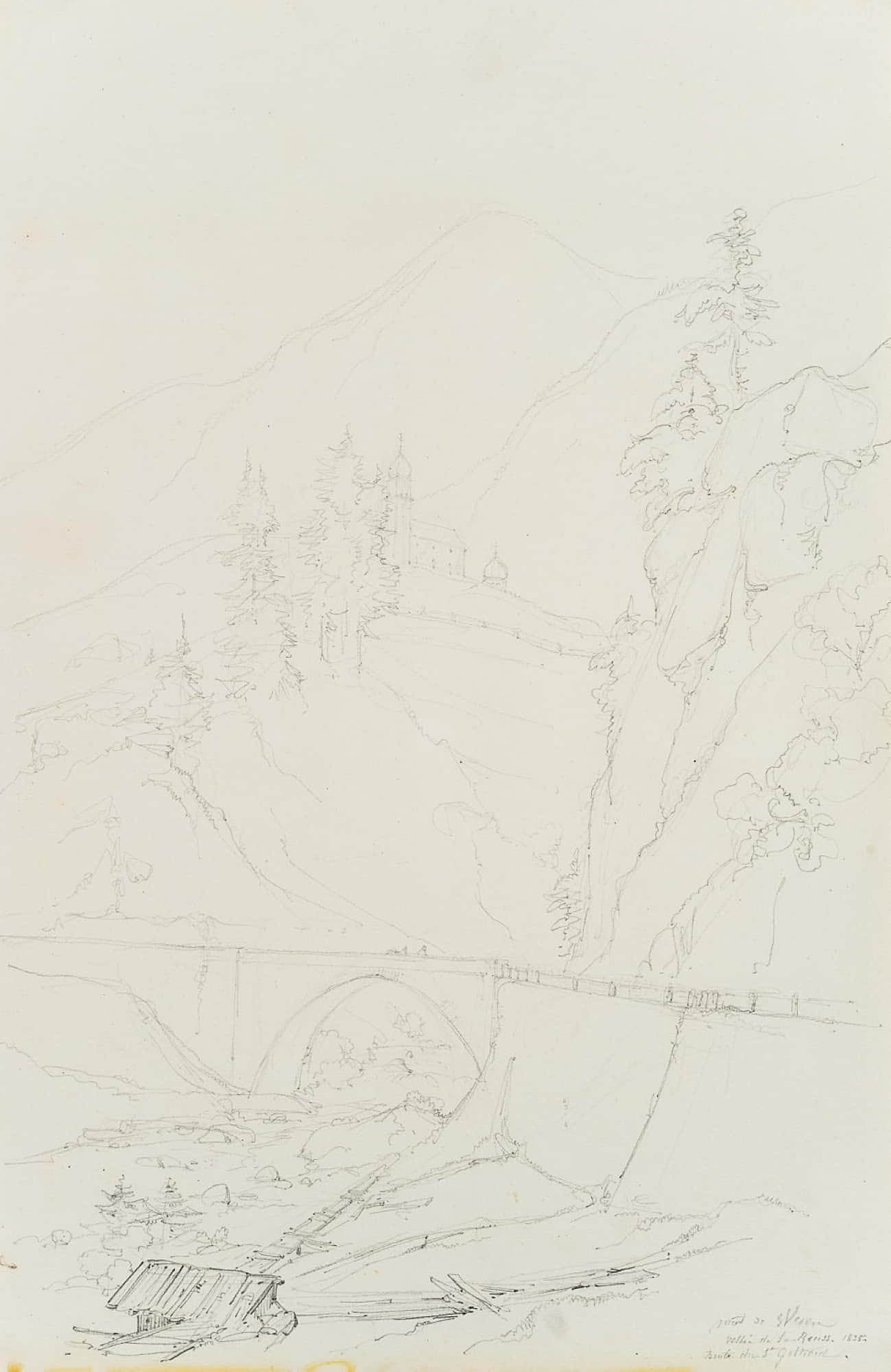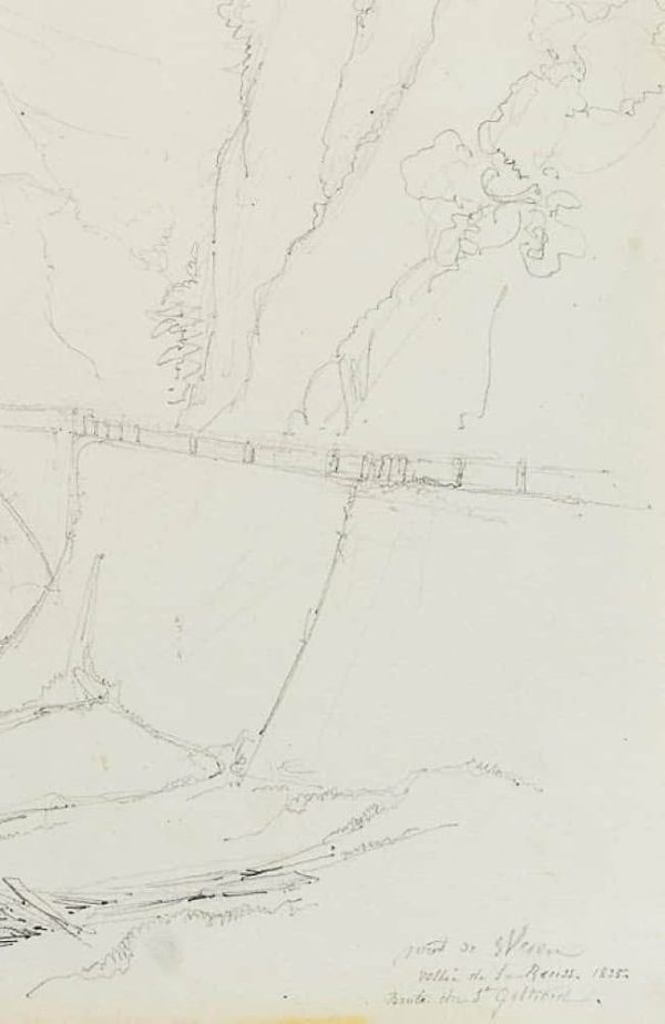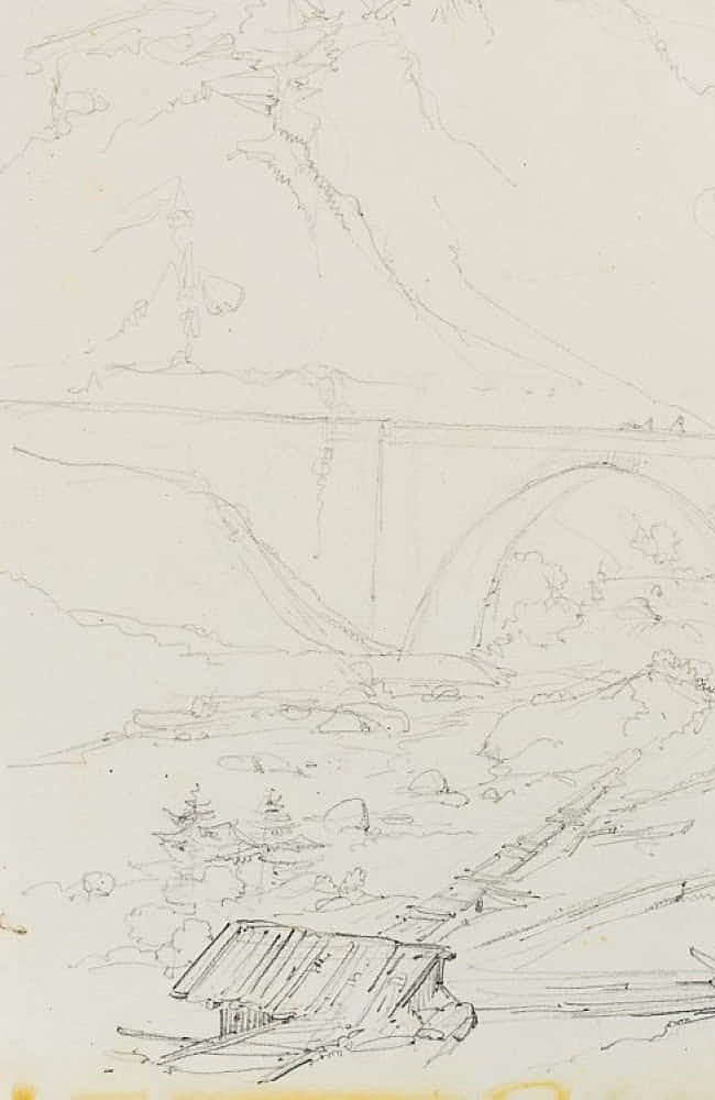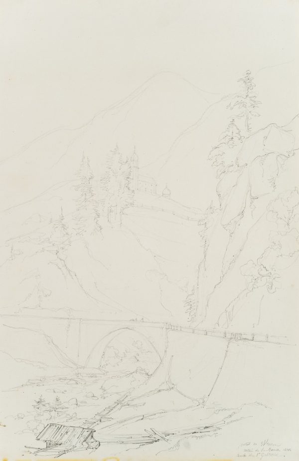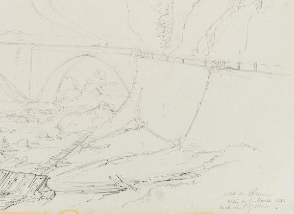 Edmond de Bretenières (1804 Dijon – 1882 ibid.), Bridge in the Reuss Valley near Wassen on the Gotthard Pass, Journey to Switzerland, Sketchbook, 1835, Pencil